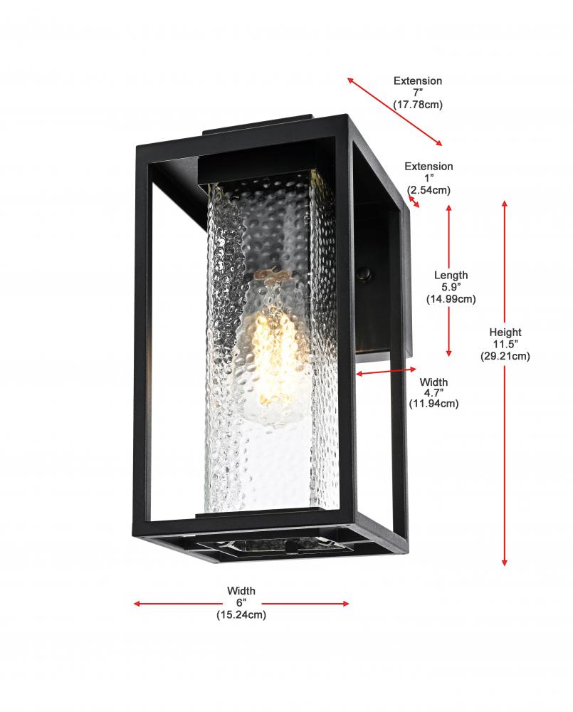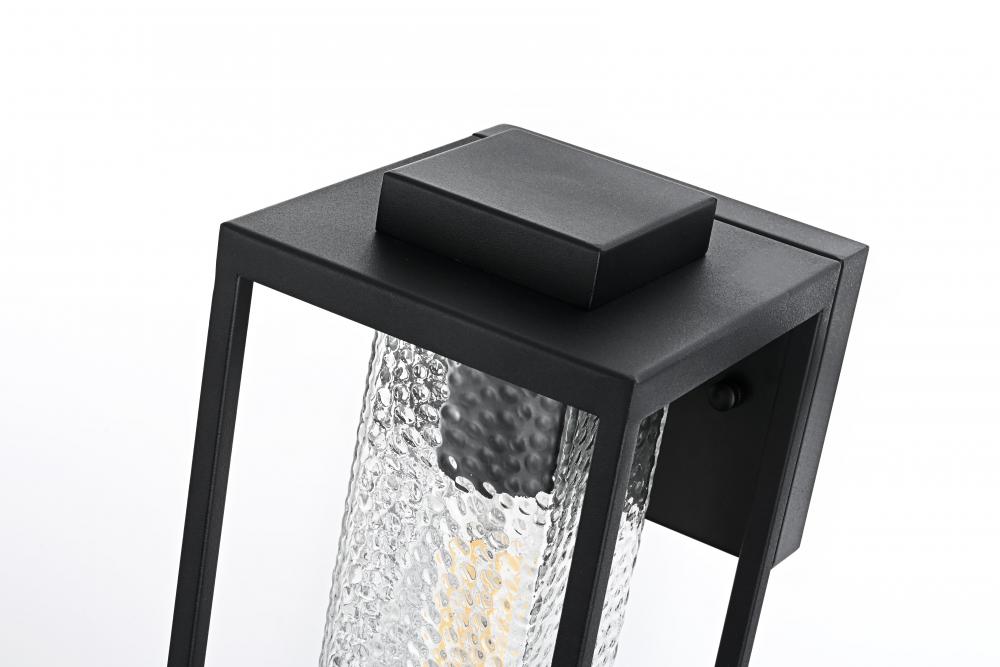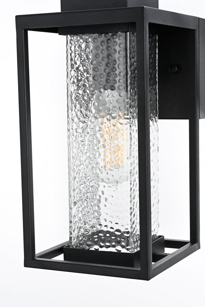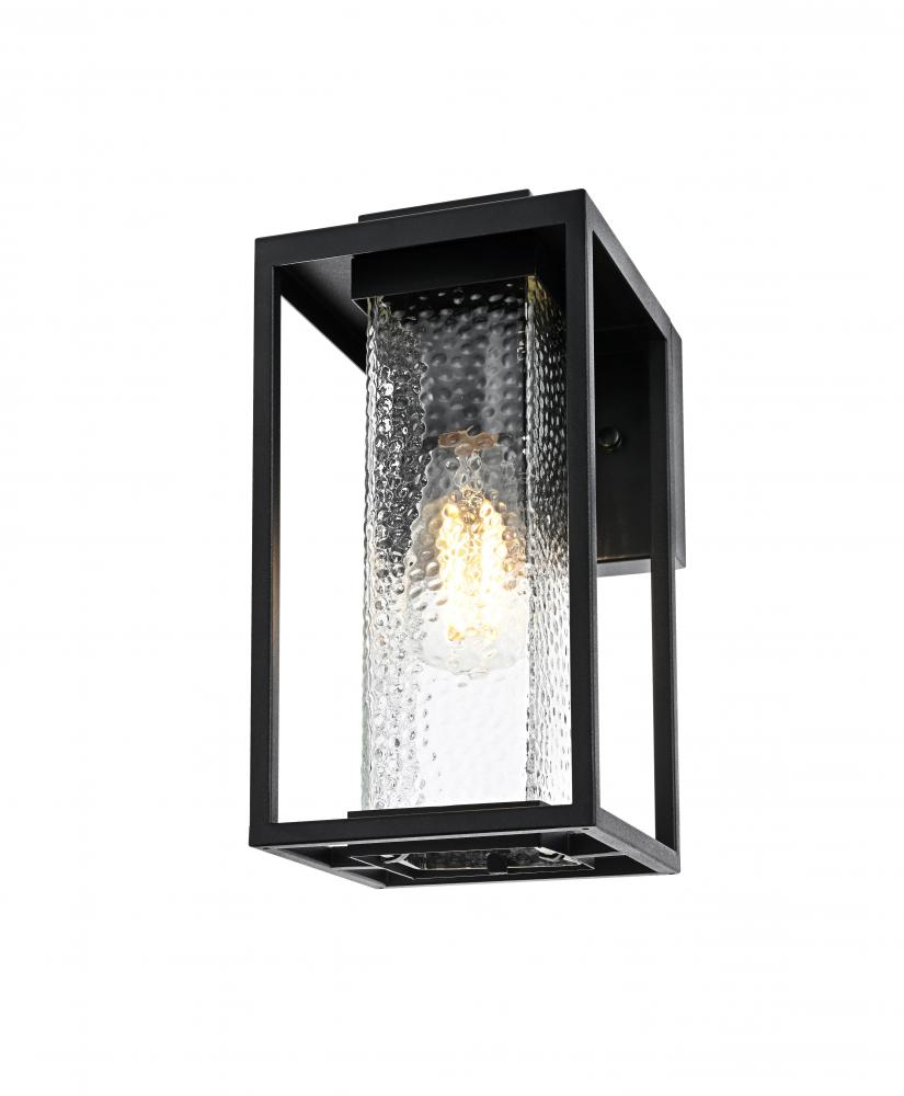 This outdoor wall sconce combines durability with a touch of character, perfectly suited to elevate your exterior space. The iron frame adds strength and durability, while the hammered glass creates a beautiful, diffused lighting effect, enhancing the warm glow of the bulb. The sharp angles and clean lines of the iron frame provide a modern touch that blends seamlessly with the rustic textures of the glass, creating a versatile look that complements a wide range of styles.