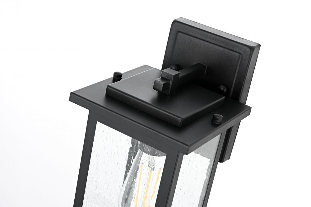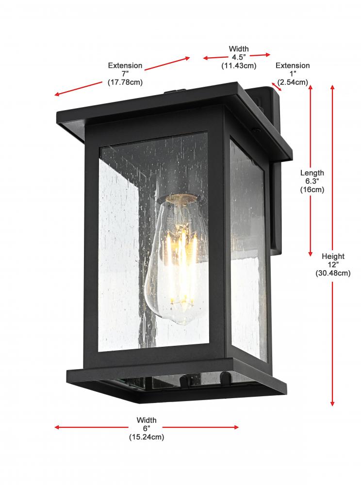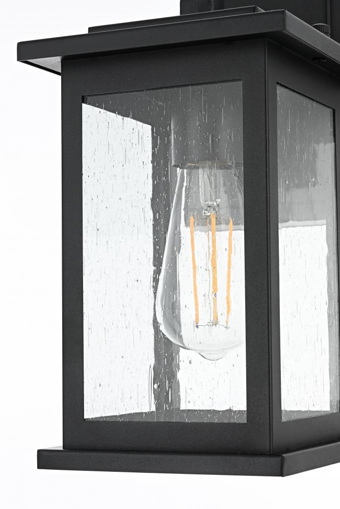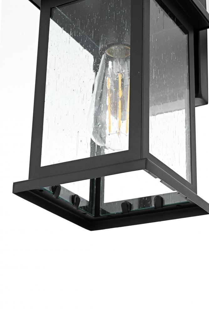Enhance your outdoor space with this stunning wall sconce, merging a sleek, modern design with timeless craftsmanship. Crafted from durable iron and combined with clear glass panels, this outdoor light exudes an inviting warmth while providing functional illumination. Its crisp rectangular silhouette and clean lines blend beautifully with a variety of architectural styles, adding sophistication to any porch, patio, or entryway. The sconce's E26 socket makes it compatible with a range of bulb types, allowing for customizable ambiance. The textured seeded glass adds depth and visual interest, effortlessly scattering light to create a soft glow. Built to withstand the elements, this sconce not only provides aesthetic appeal but also offers reliable outdoor illumination that you can count on for years to come.
