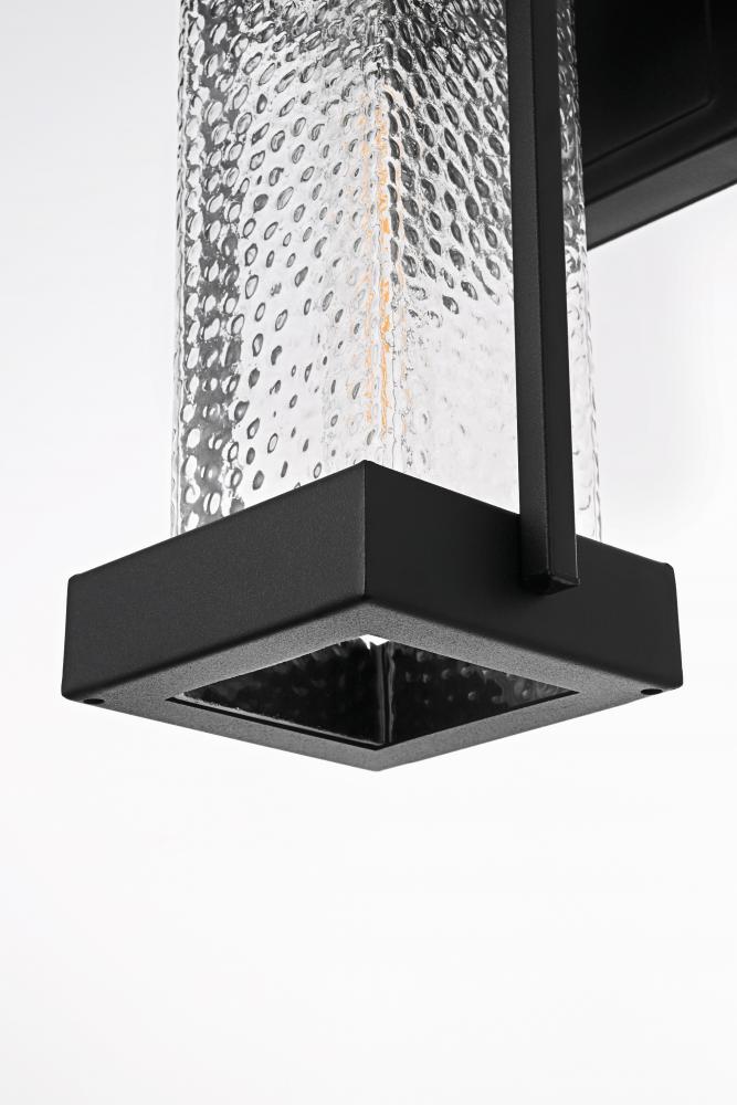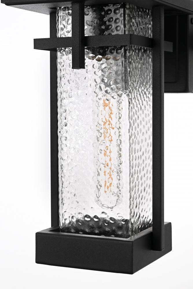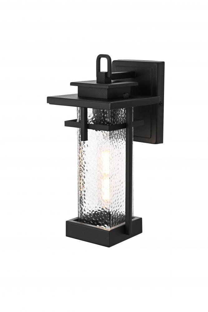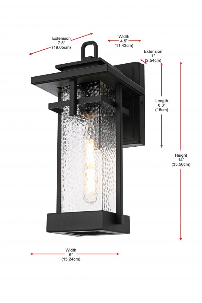 This outdoor wall sconce embodies a timeless design that adds an upscale touch to any exterior space. Crafted from durable iron and clear hammered glass, it effortlessly merges aesthetics and practicality. The hammered glass creates a warm and inviting glow, making it perfect for lighting pathways, porches, or garden areas. The E26 socket base allows for versatility in bulb selection to create the ambiance of your choice, and the sconce is designed to withstand weather exposure, ensuring long-lasting performance. The top roof cap design adds a classic accent while enhancing light direction, making it both stylish and functional for any home exterior.