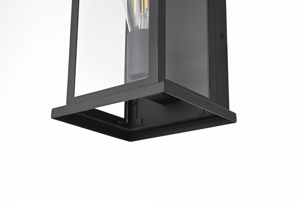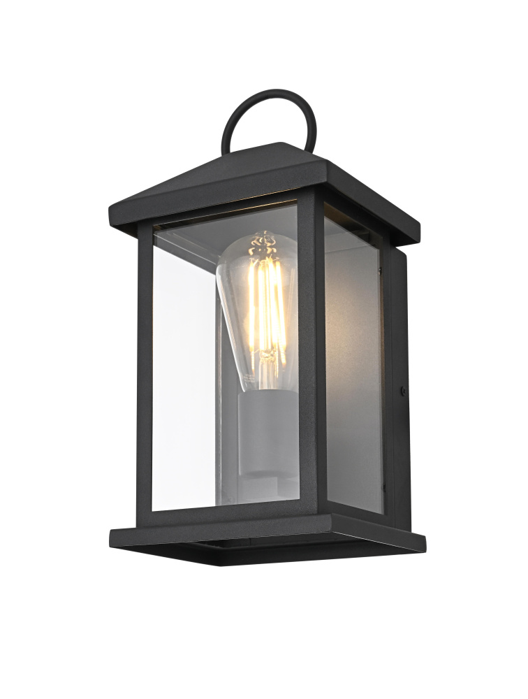 Enhance your outdoor space with the charm and functionality of this modern lantern-style wall light. A strong iron frame, finished in bold matte black, creates a timeless architectural presence, while clear glass panels allow the bulb’s warm glow to shine through unobstructed. A decorative ring detail at the top adds a subtle nod to classic lantern designs, blending tradition with modern refinement. The open-bottom design ensures easy bulb changes and effortless maintenance, making it as practical as it is stylish. Designed with an E26 socket (bulb not included), this light allows for complete customization in brightness and style. Wet rated for durability, it’s the perfect lighting solution for front porches, patios, and outdoor walkways, offering a radiant, welcoming ambiance year-ro