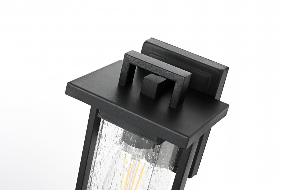 Transform your outdoor space with this striking iron and glass wall sconce, where classic design meets modern functionality. Crafted from durable iron, this sconce exudes a sturdy and timeless appeal, while the textured glass panes add visual depth, creating a glowing ambiance perfect for any exterior setting. The light fixture beautifully combines clean lines and soft accents, making it ideal for both traditional and modern homes. Its rugged black finish complements various decor styles, while the seeded glass subtly diffuses the light, delivering a warm and inviting glow that enhances curb appeal and nighttime visibility. Designed with durability in mind, this sconce is built to withstand the elements, making it a perfect lighting solution for patios, entryways, and gardens.