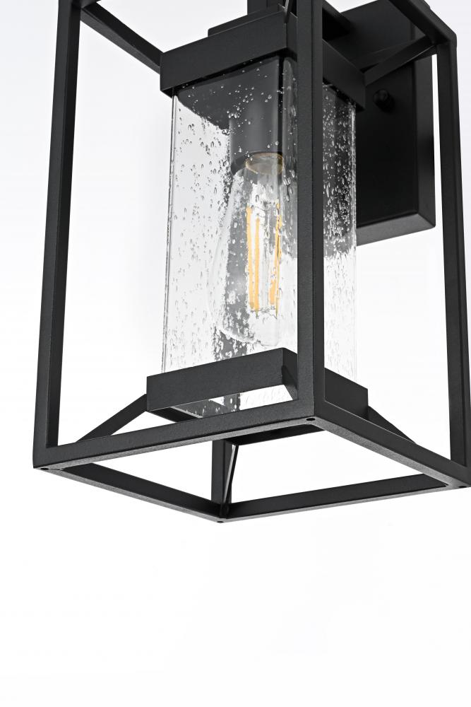 This outdoor wall sconce blends modern simplicity with timeless charm. The sturdy iron frame is designed in a geometric shape, beautifully housing the clear seeded glass that allows the warm glow of the light to shine through. The clear seeded glass adds texture to the illumination, creating an inviting and sophisticated glow that transforms the exterior of your home. with an E26 socket base that easily accommodates standard bulbs, this fixture not only provides style but also high functionality. Whether flanking your front door or lighting up your patio, this sconce elevates your outdoor space with a crisp, contemporary look that is both durable and refined.