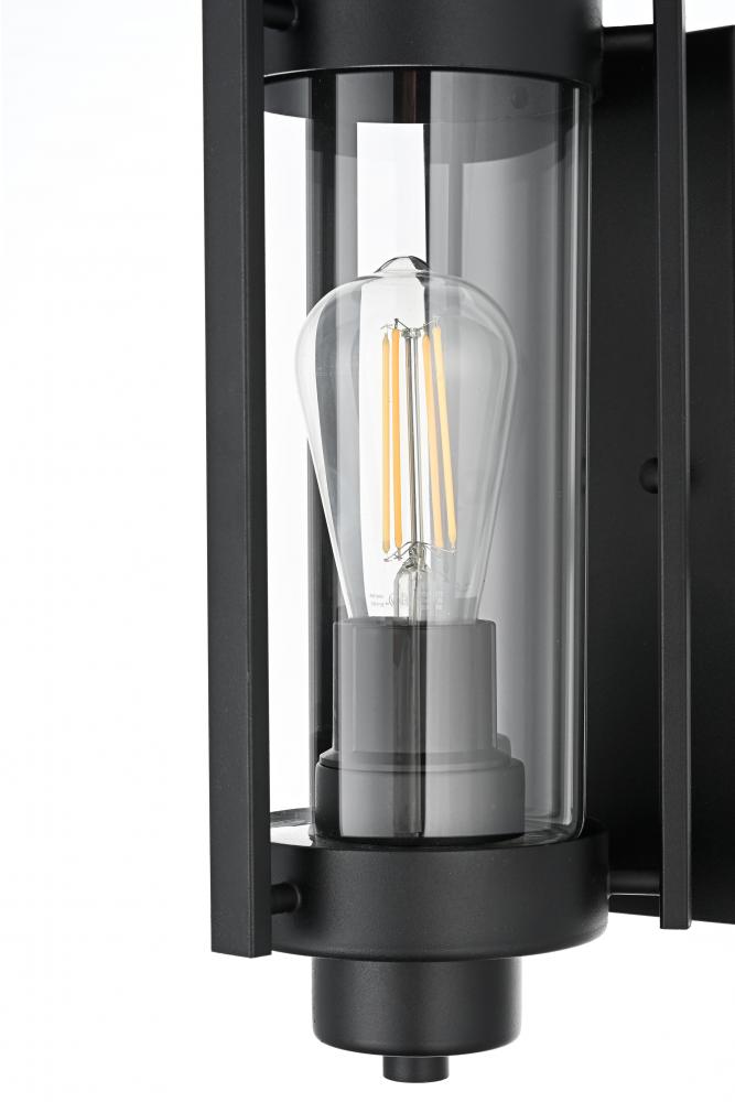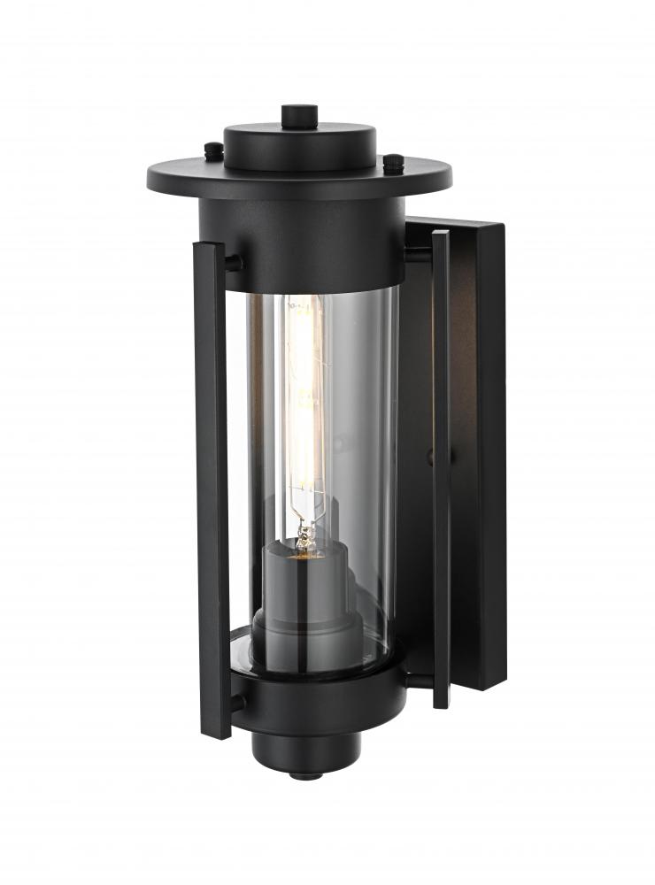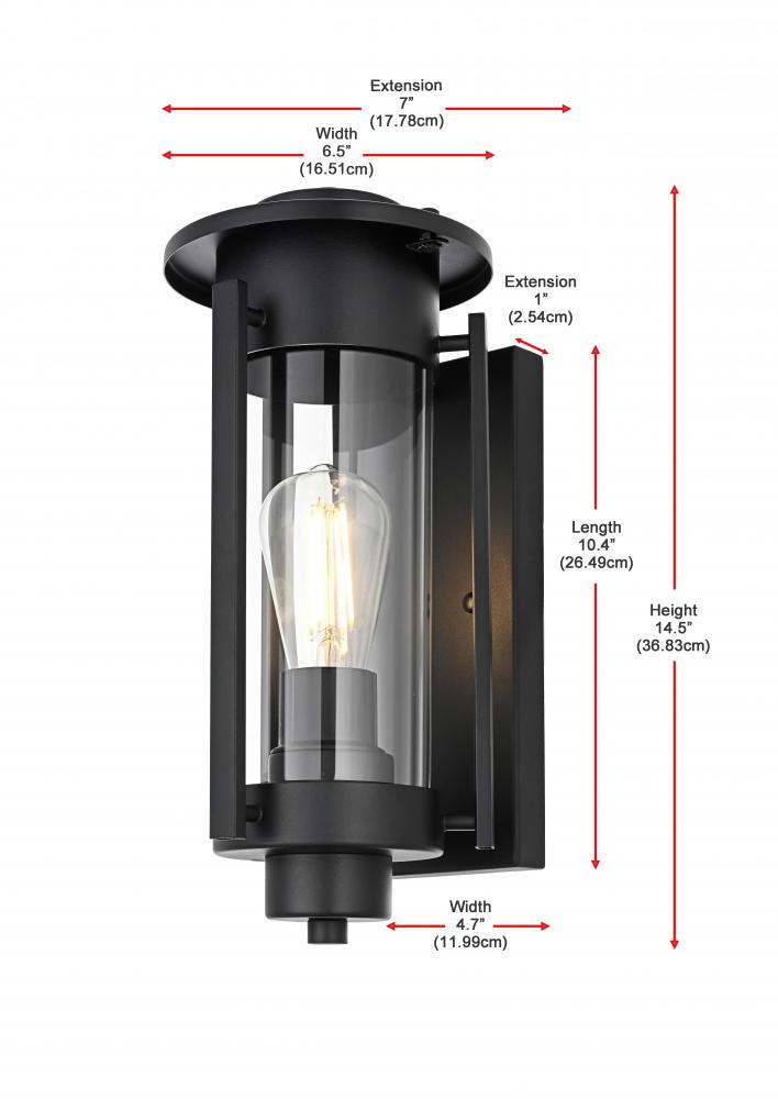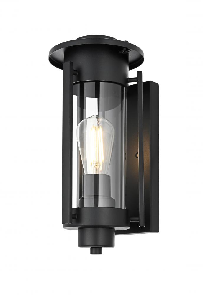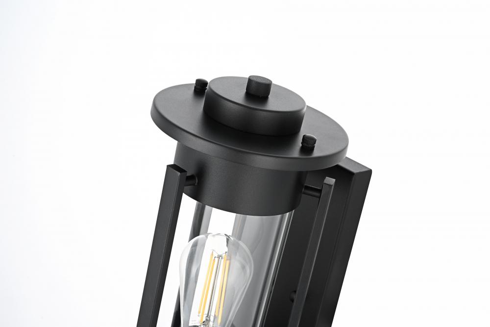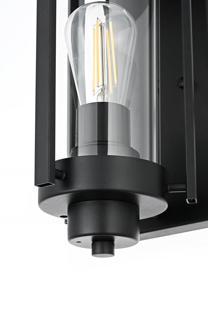 This outdoor wall sconce combines traditional charm with modern sophistication. Crafted with a sturdy iron frame and clear glass panels, this fixture exudes a refined, timeless aesthetic that works beautifully in a variety of exterior settings. The clean lines of the rectangular frame, coupled with an exposed bulb that uses an E26 socket, offer a stylish touch to patios, entryways, or garden walls. The sconce features an attractive interplay between the classic silhouette and the contemporary black finish, creating a balanced design that makes any outdoor area look more inviting.