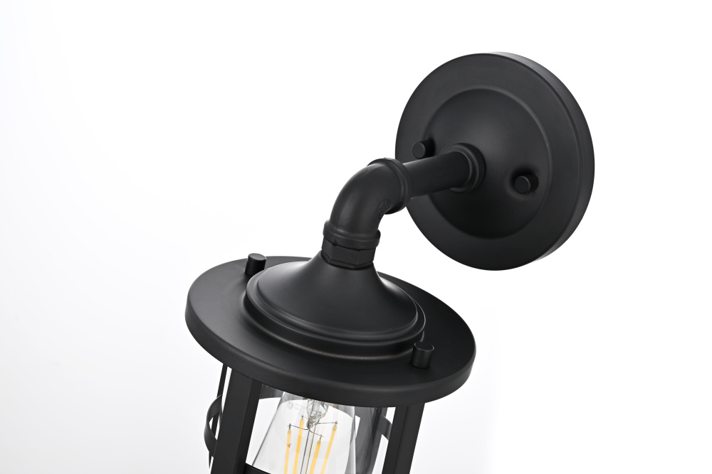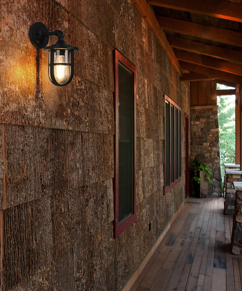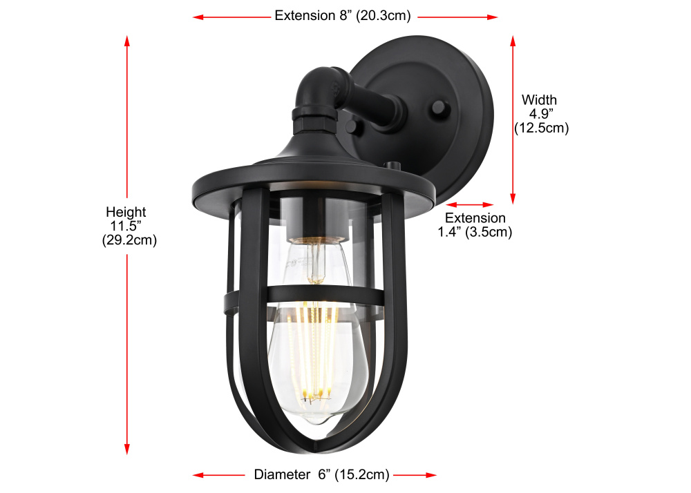 Bring industrial character and durable functionality to any outdoor space with a rugged wall light that merges bold design with practical illumination. A sturdy matte black frame encases a clear glass cylinder, allowing light to shine freely while maintaining a refined, structured appearance. The protective cage adds a layer of strength and visual interest, making this fixture perfect for porches, garages, and entryways. A pipe-inspired curved arm extends from the circular backplate, lending a factory-style aesthetic that blends seamlessly with farmhouse, nautical, and industrial settings. Designed with an E26 socket (bulb not included), this wet-rated wall light is built to withstand the elements, ensuring year-round performance in any climate. Whether paired with an Edison bulb for vintage appeal or a bright LED for crisp illumination, this bold outdoor sconce delivers both style and function to exterior spaces.