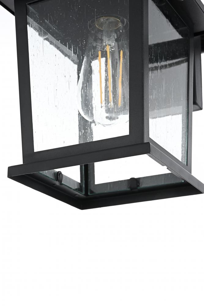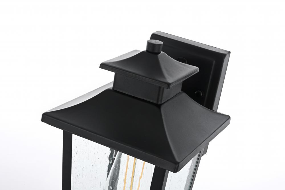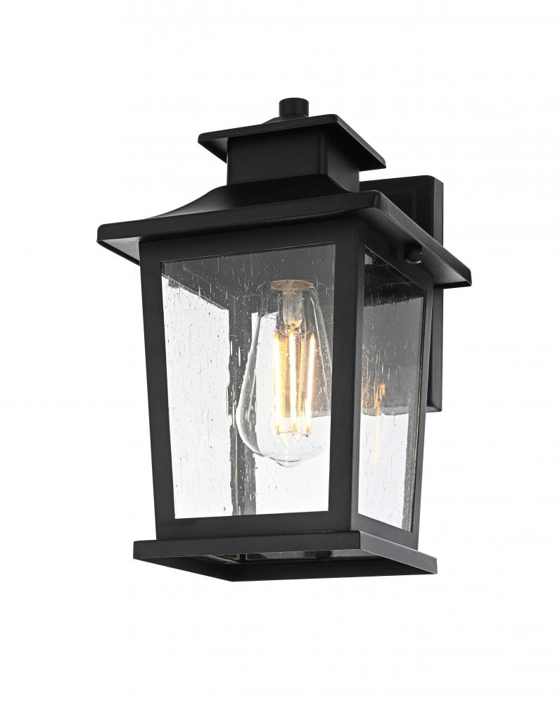 Add a timeless appeal to your exterior with this sophisticated outdoor wall sconce. Crafted from sturdy iron and glass, this wall sconce features a classic lantern-inspired design with clean lines and clear seeded glass panels that add both form and function to your outdoor space. Its matte black finish beautifully contrasts with the bright glow from the E26 bulb, creating a warm and welcoming ambiance for any entryway, porch, or patio. The open base design ensures effortless bulb replacement while the robust materials provide durability, even in changing weather conditions. This wall sconce is perfect for those who want to enhance their outdoor decor with a fixture that showcases both contemporary charm and vintage flair.