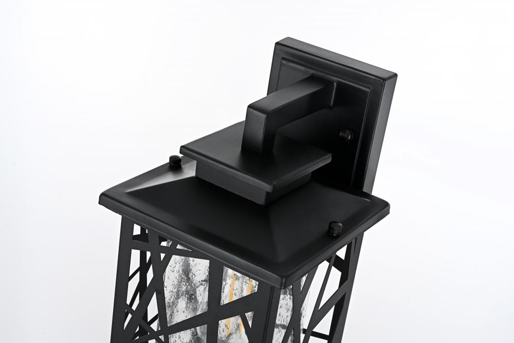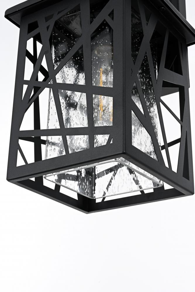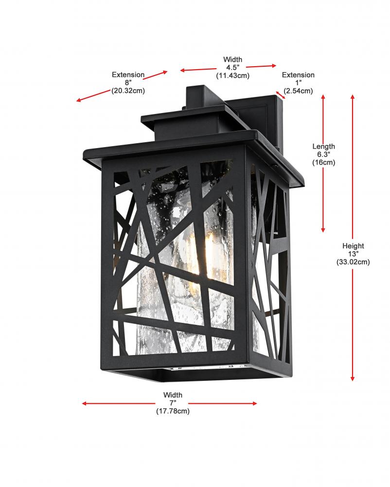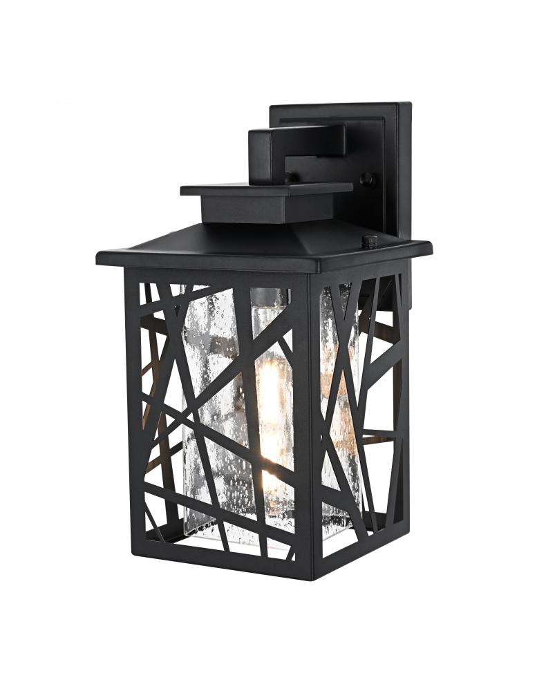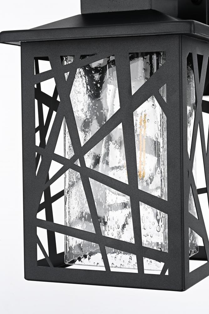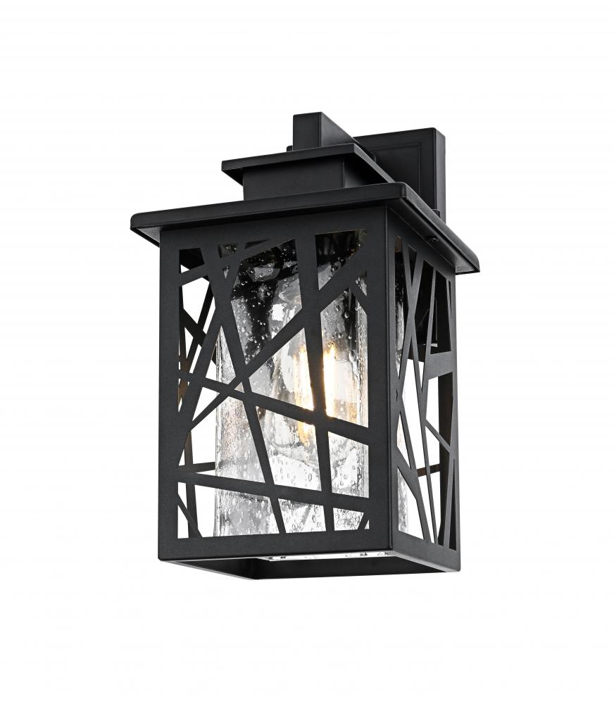 Transform the ambiance of your outdoor space with this sophisticated outdoor wall sconce, crafted with a robust iron frame and shimmering seeded glass panels. Its geometric design blends seamlessly with modern architectural styles, providing a dynamic aesthetic to any outdoor environment. Featuring a standard E26 socket, this sconce accommodates a variety of bulb styles, offering both versatility and style. The sturdy iron frame is finished in matte black, giving it a refined appearance while enhancing durability. The unique crackled glass creates a captivating lighting effect, adding warmth and character to your patio, porch, or garden space. Built to withstand the elements, this wall sconce offers an inviting glow and provides a standout feature to your outdoor decor.
