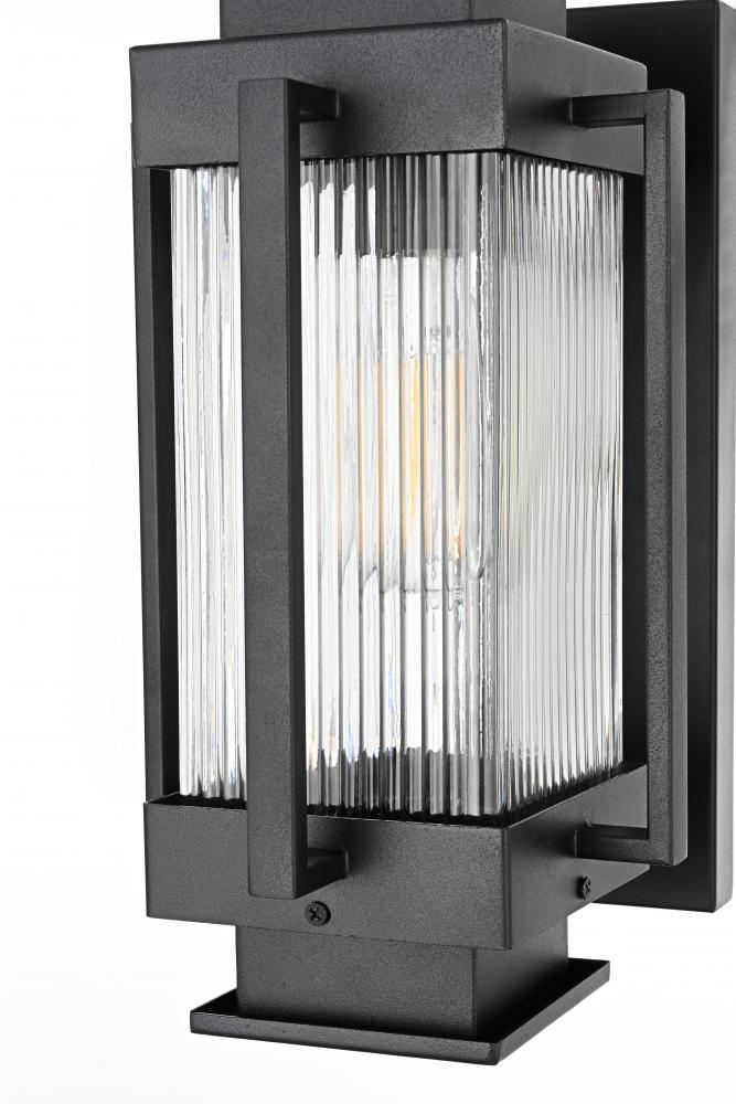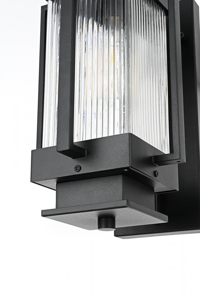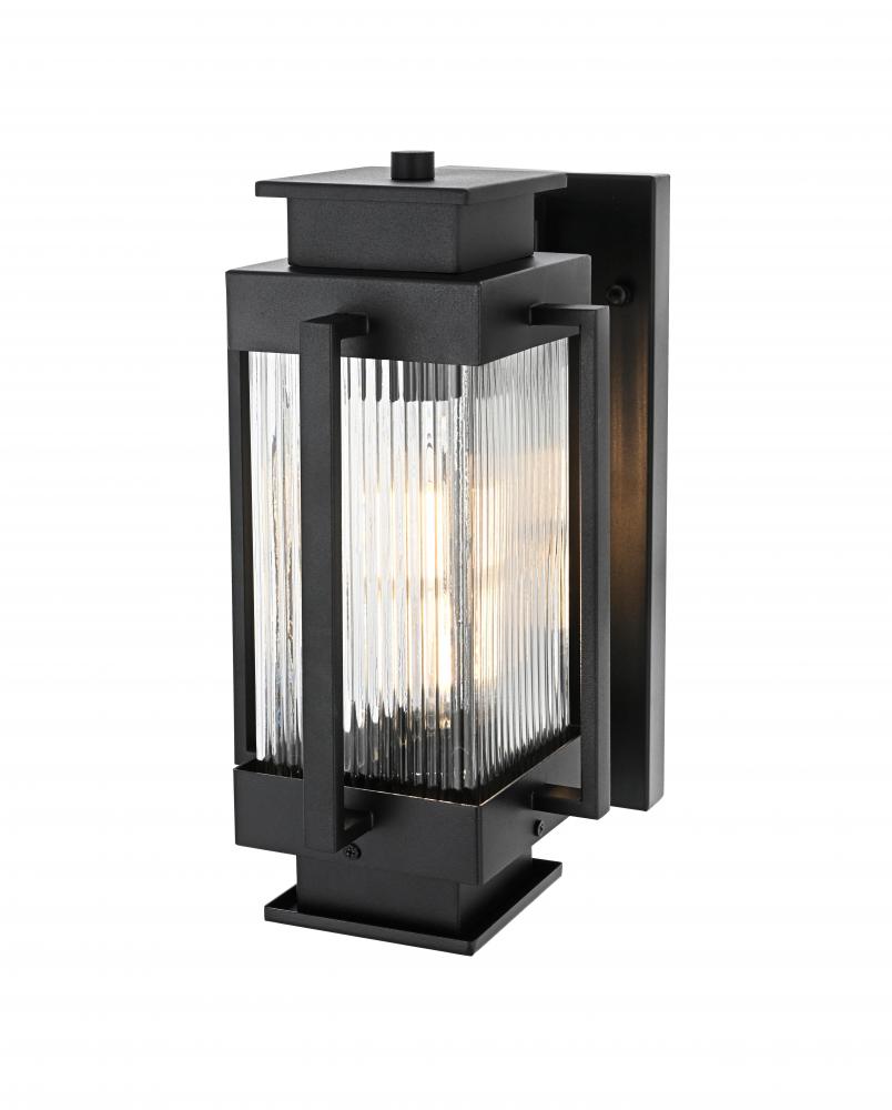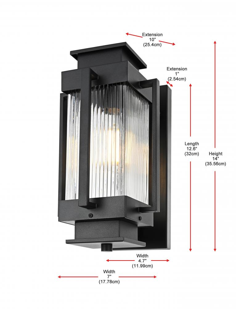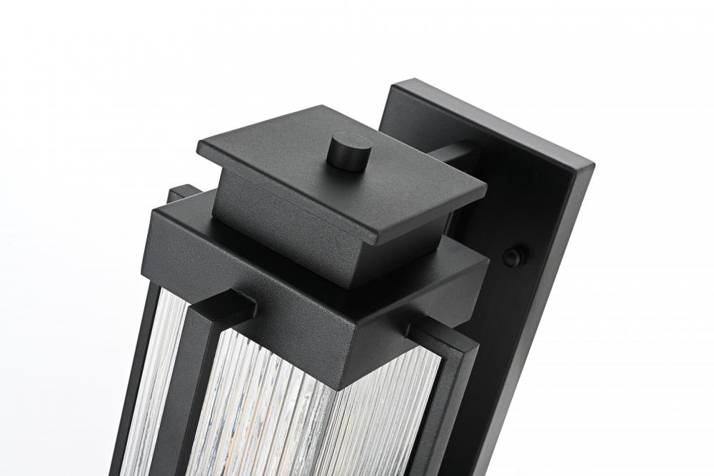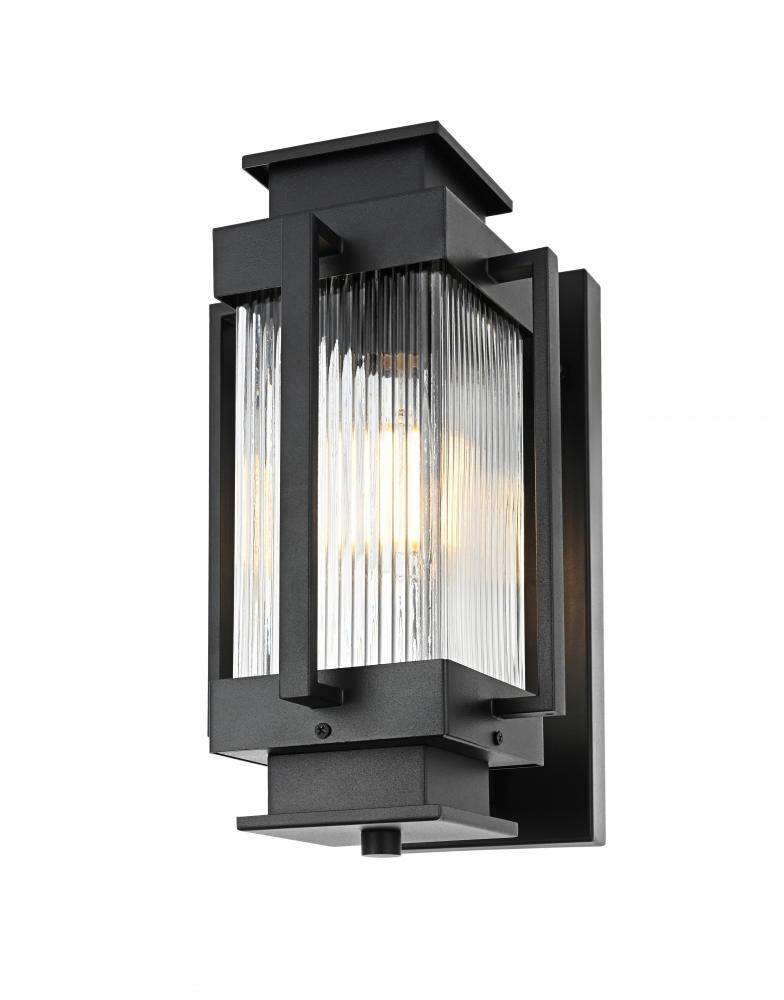 Add a contemporary charm to your outdoor spaces with this stunning outdoor wall sconce. Crafted from durable iron with a striking matte black finish, this wall sconce effortlessly blends modern design with classic details. The centerpiece of this fixture is its ribbed glass cylinder, designed to create a play of light and shadow that adds depth and dimension to your home’s exterior. The clean lines and the boxy, geometric silhouette make it a perfect match for a variety of architectural styles, from minimalist to industrial. Featuring an E26 socket, this sconce is compatible with a variety of bulbs, giving you flexibility in setting the desired ambiance. Built with weather-resistant materials, this light is made to withstand the elements while providing warmth and inviting character to any porch, patio, or entryway.