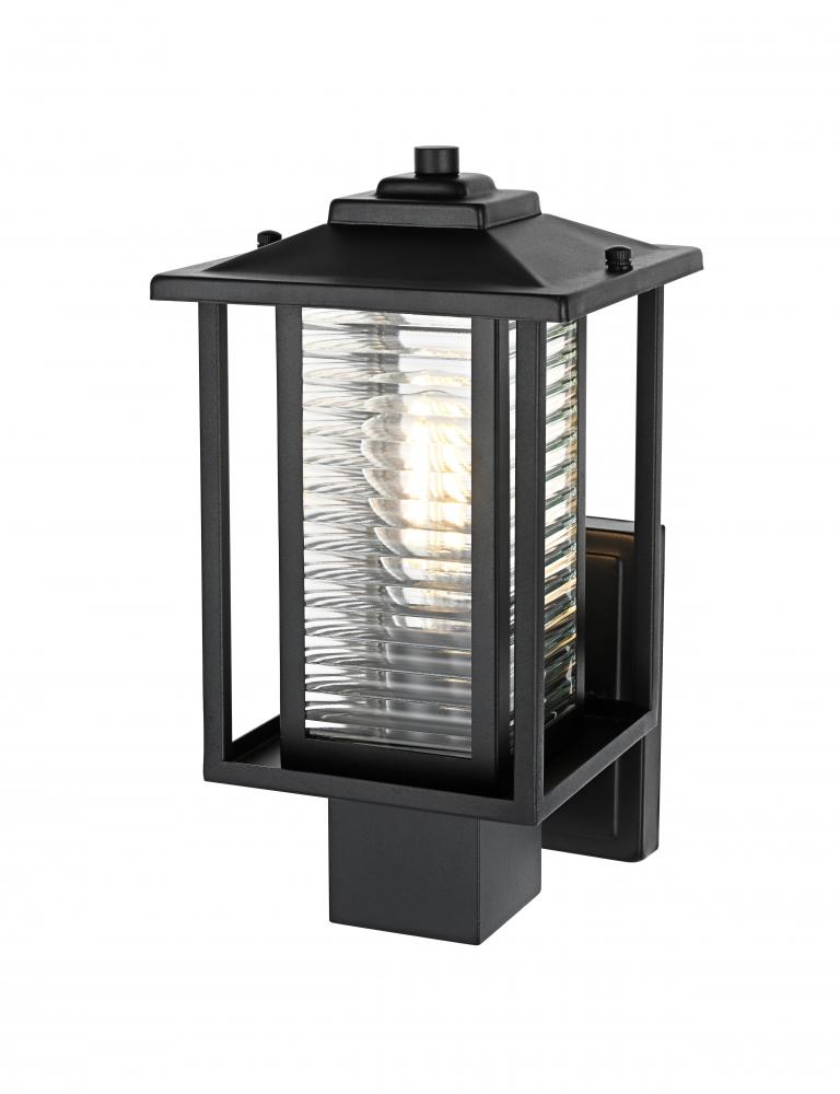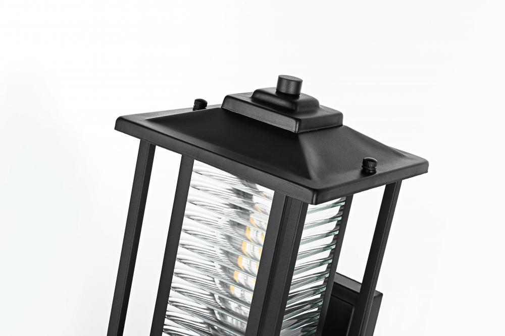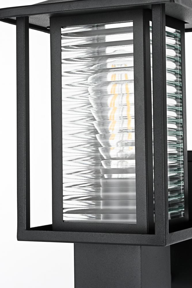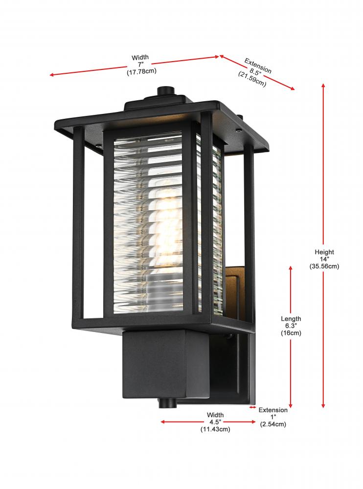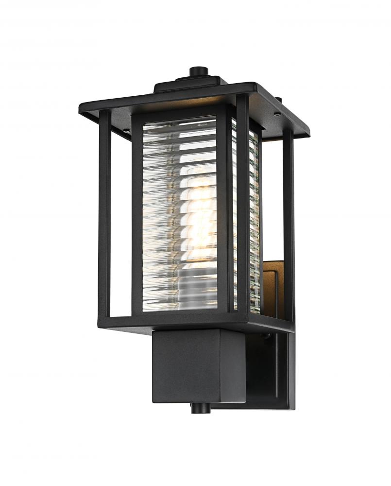 This outdoor wall sconce blends traditional and modern aesthetics, featuring a timeless black iron finish paired with refined ribbed glass panels. The iron frame’s linear silhouette highlights a combination of solid structure and clean, minimalistic lines, while the E26 socket allows for versatile bulb choices to create just the right amount of ambient lighting for your porch, patio, or garden. The ribbed glass not only helps diffuse light softly, creating a welcoming glow, but also adds an appealing texture that enhances the visual depth of the sconce. The robust construction makes this light ideal for withstanding the elements, ensuring your outdoor space stays beautifully lit for years to come.