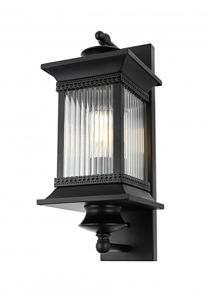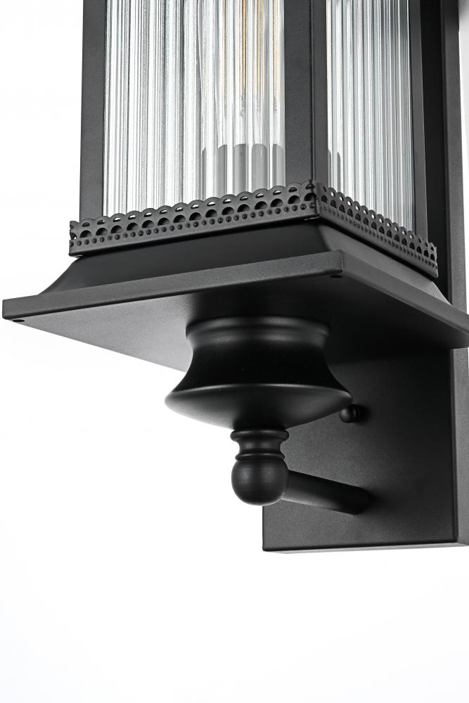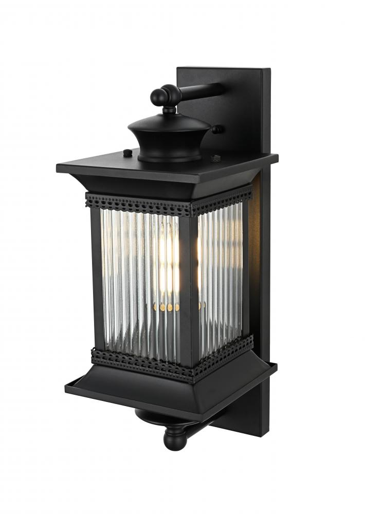 Enhance your home's exterior with this thoughtfully designed outdoor wall sconce that combines timeless character with modern functionality. The wall sconce features a robust iron construction that offers both durability and a bold architectural presence, making it a charming addition to your entryway or patio. Its signature black finish contrasts beautifully with the intricate ribbed glass panels, which cast enchanting, diffused illumination that adds a touch of warmth to any evening. The decorative accents along the trim exude a sense of sophistication, while the robust shape lends itself to a versatile range of outdoor styles—from classic to contemporary. This wall sconce serves as both a functional light source and a statement piece that complements your outdoor space with unique artistry.