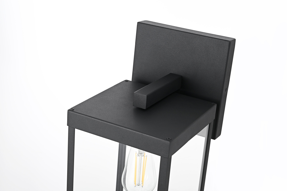 Bring definition and clarity to outdoor spaces with a modern lantern that makes a statement. A crisp rectangular frame, crafted from durable iron with a matte black finish, offers a bold contrast to the clear glass panels that surround the bulb. The structured design features an enclosed bottom for a clean and finished look, while the suspended bulb effect creates a striking focal point. A minimalist backplate and streamlined mounting arm maintain the sleek aesthetic, making this wet-rated wall light perfect for patios, entryways, and garages. Designed with an E26 socket (bulb not included), this lantern provides customizable lighting to enhance any exterior with precision and style.