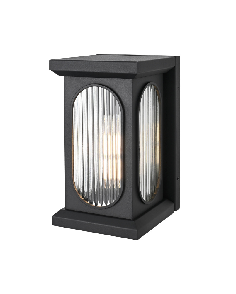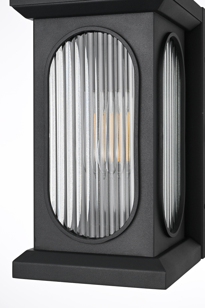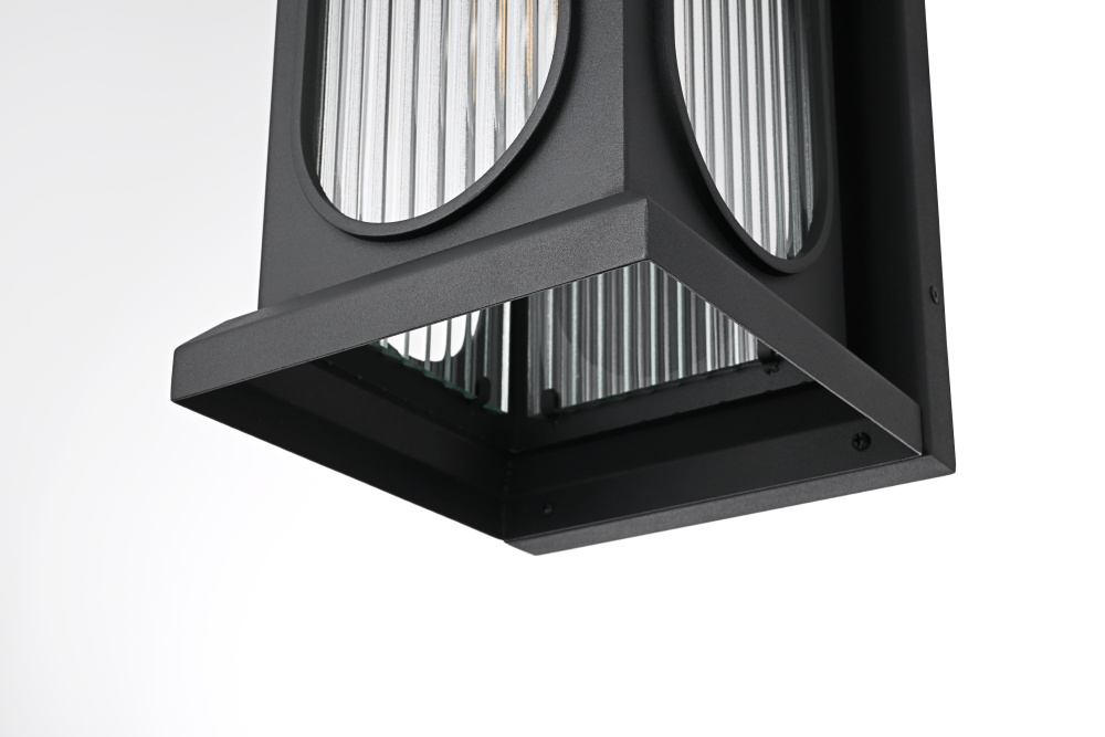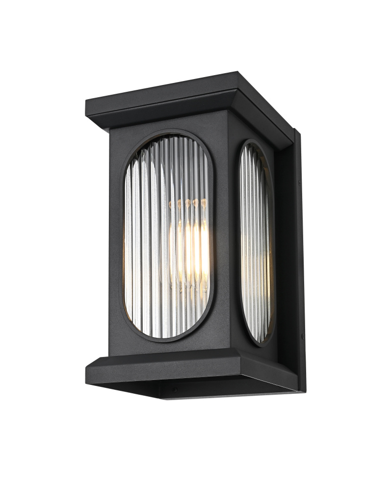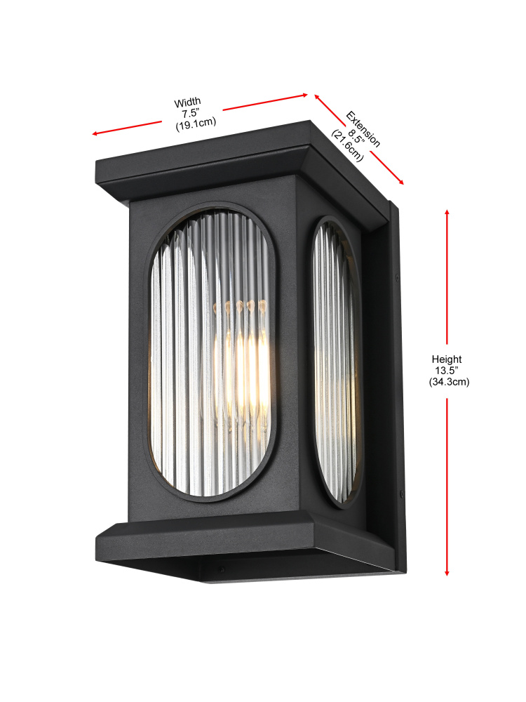 Make a bold statement with an outdoor wall light that combines structured lines with rich texture. A sturdy rectangular frame, finished in deep matte black, surrounds striking clear fluted glass panels that create a glowing, rippled effect when illuminated. The curved oval inserts soften the geometric shape, offering a balanced mix of bold structure and subtle detailing. With an enclosed bottom for a refined finish, this wet-rated wall light is built to endure outdoor conditions while maintaining its standout appeal. Designed with an E26 socket (bulb not included), it pairs effortlessly with vintage Edison bulbs for a warm glow or LED options for energy efficiency. Whether framing a front door, lighting up a patio, or brightening a side entry, this standout piece blends texture and form for a captivating outdoor look.