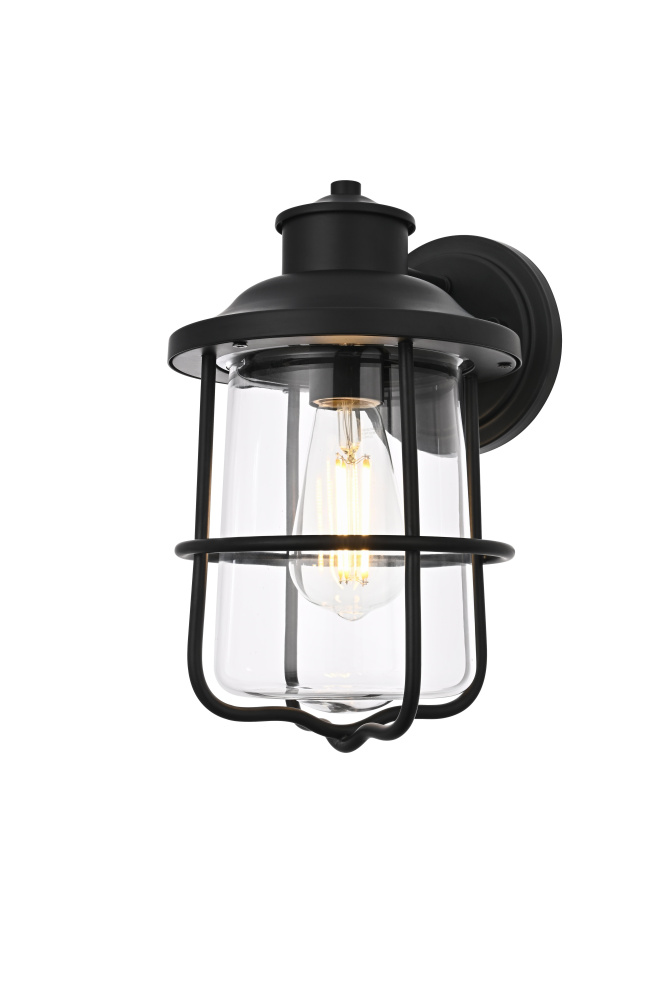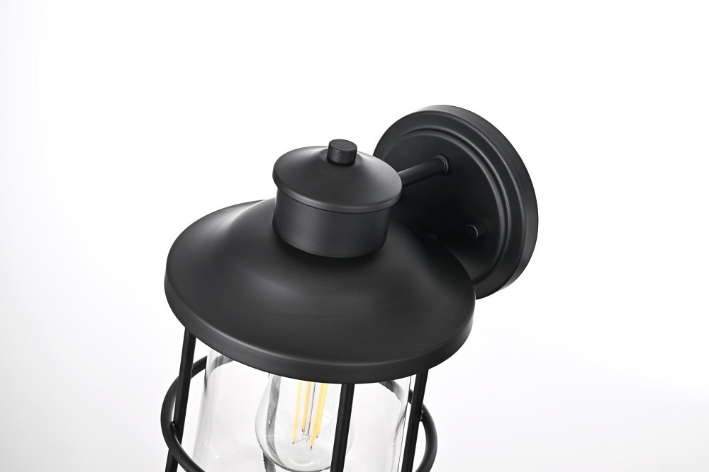 Enhance outdoor spaces with a wall light that blends industrial strength with vintage-inspired charm. A sturdy metal frame, finished in matte black, surrounds a clear glass enclosure, allowing bright, unobstructed illumination for porches, entryways, and garages. A protective cage adds durability while reinforcing the lantern’s rugged aesthetic, making it a stylish yet practical choice for exterior lighting. The rounded cap with subtle tiered detailing softens the overall look, offering a refined touch to its structured form. Designed with an E26 socket (bulb not included), this wet-rated wall light withstands the elements while delivering a timeless glow. Whether paired with an Edison bulb for vintage appeal or a bright LED for energy efficiency, this outdoor sconce offers both striking design and functional performanc