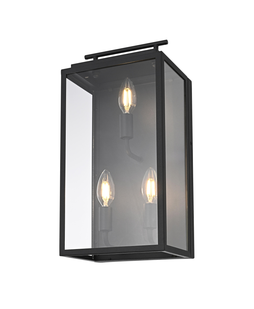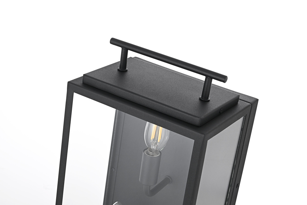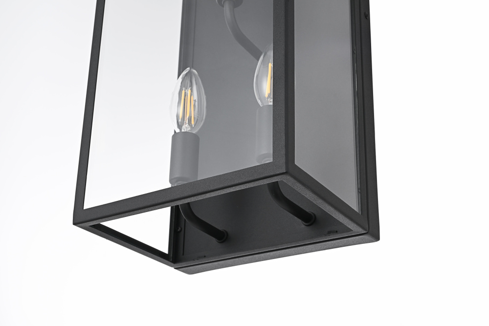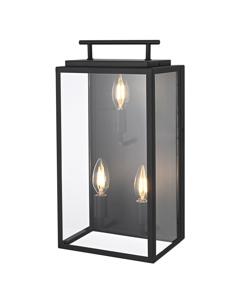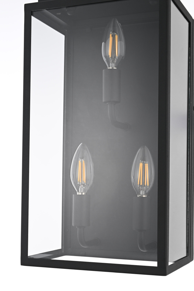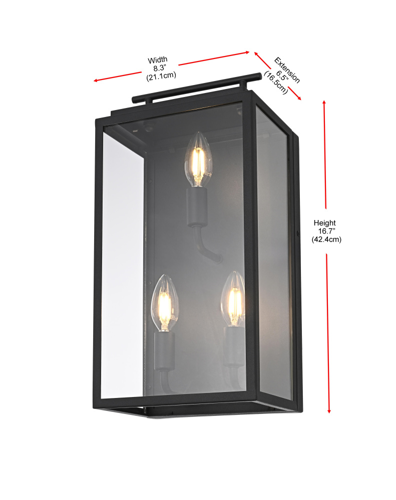 Enhance outdoor spaces with a wall light that blends sharp geometry with practical design. A structured rectangular iron frame, finished in matte black, surrounds crystal-clear glass panels that showcase the bulb in its full glow. A distinctive floating handle detail at the top adds a subtle industrial touch, while the open-bottom construction ensures easy bulb replacement and efficient downward lighting. Designed with three E26 sockets (bulb not included), this wet-rated wall light is built to endure outdoor elements, making it a perfect choice for patios, garage exteriors, and entryways. Whether paired with a vintage Edison bulb for a classic touch or a bright LED for maximum efficiency, this versatile lighting piece adds both style and function to any exterior setting.