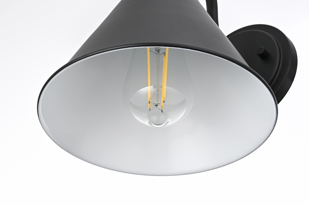 Bring a striking, modern touch to outdoor spaces with a conical gooseneck wall light that blends industrial inspiration with sleek design. A sharply defined matte black metal shade directs light downward for functional illumination, while the crisp white interior enhances brightness for a well-lit entryway or patio. The smoothly curved gooseneck arm extends gracefully from the circular backplate, creating a balanced look that stands out against exterior walls. With an E26 socket (bulb not included), this wet-rated wall light is built for outdoor durability, making it an ideal choice for garages, porches, and storefronts. Whether styled with a warm Edison bulb for a vintage feel or an LED for modern efficiency, this statement piece adds both style and practicality to any outdoor setting.