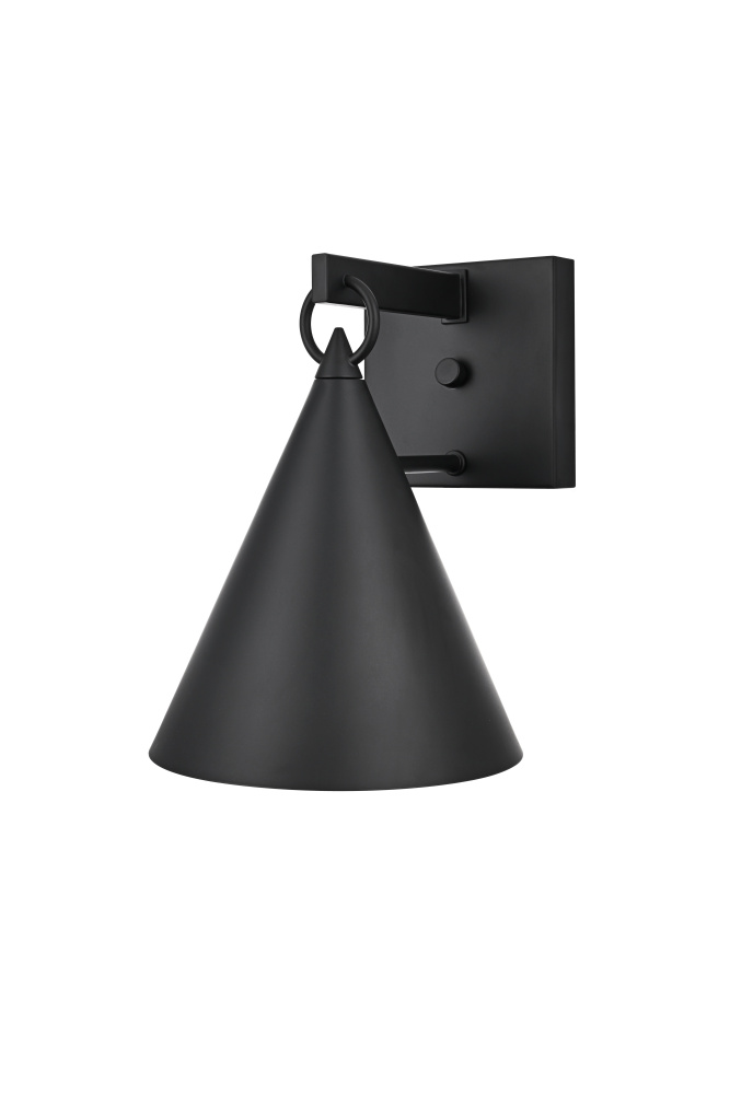 Transform any outdoor space with a statement wall light that blends sharp geometry with sleek modern appeal. A bold conical metal shade, finished in matte black, directs light downward for focused illumination, while the crisp white interior enhances brightness for a well-lit entryway or patio. A decorative ring detail adds a unique touch, softening the structured design and providing an artistic element. Supported by a sturdy squared backplate, this striking outdoor sconce maintains a strong architectural presence. The open-bottom shade ensures bright, practical lighting while making bulb replacements effortless. Designed with an E26 socket (bulb not included), this wet-rated fixture is built for durability, making it a stylish yet functional choice for porches, storefronts, and garage exteriors. Whether paired with an Edison bulb for a warm glow or a bright LED for crisp illumination, this standout piece elevates any outdoor setting with its sharp, modern aesthetic.
