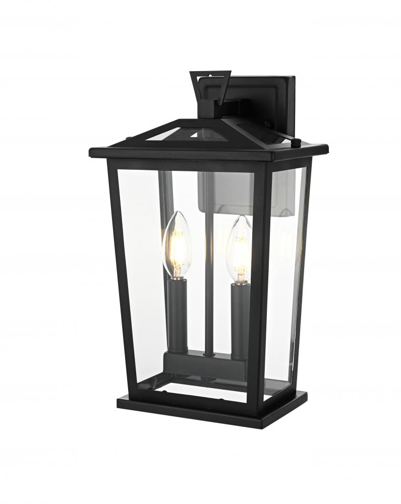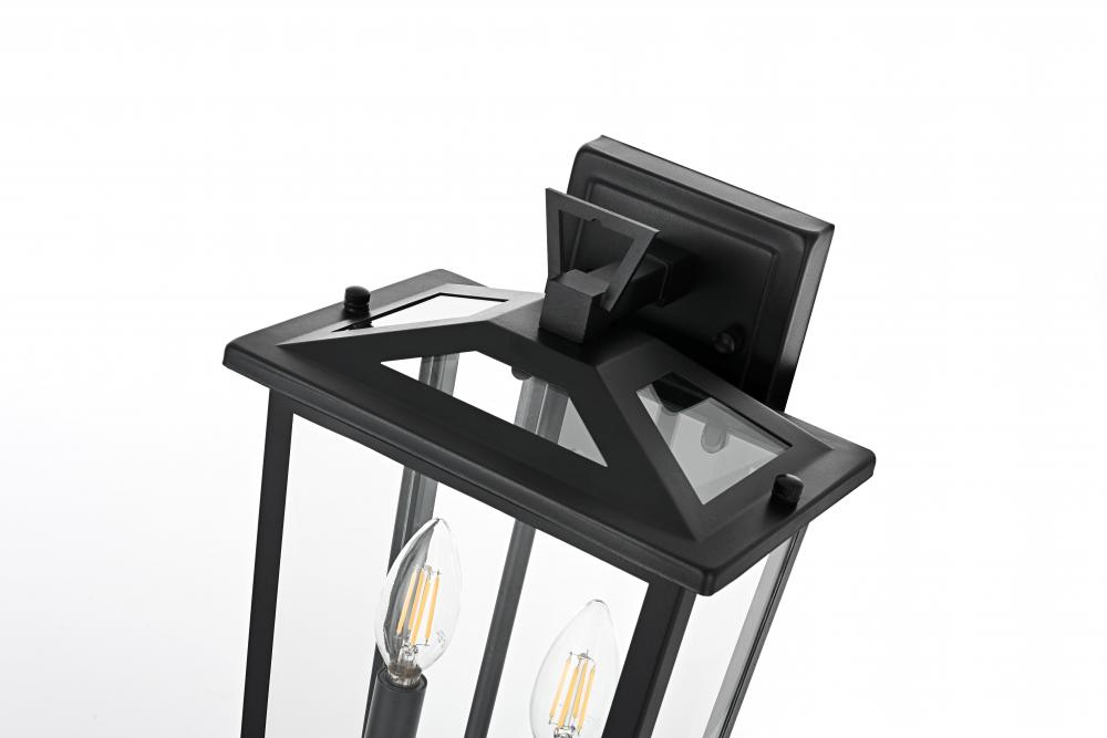 Enhance your outdoor space with this stylish wall sconce that features a striking matte black frame paired with clear glass panels, perfectly showcasing its modern charm. The latern box shape is adorned with a distinctive triangular loop on top, adding a unique architectural touch that seamlessly combines functionality with a bold, sleek aesthetic. The open bottom design allows for easy bulb changes and casts a beautiful downward light, adding a welcoming glow to your entrance or patio area. Crafted from durable iron with a clean, modern style, this wall sconce is perfect for those who appreciate a blend of simplicity and contemporary design. The clear glass ensures maximum light output, enhancing visibility while emphasizing the beautiful shape of the bulb inside. The E12 socket offers versatility for different bulb styles, allowing you to easily customize the ambiance of your outdoor area.