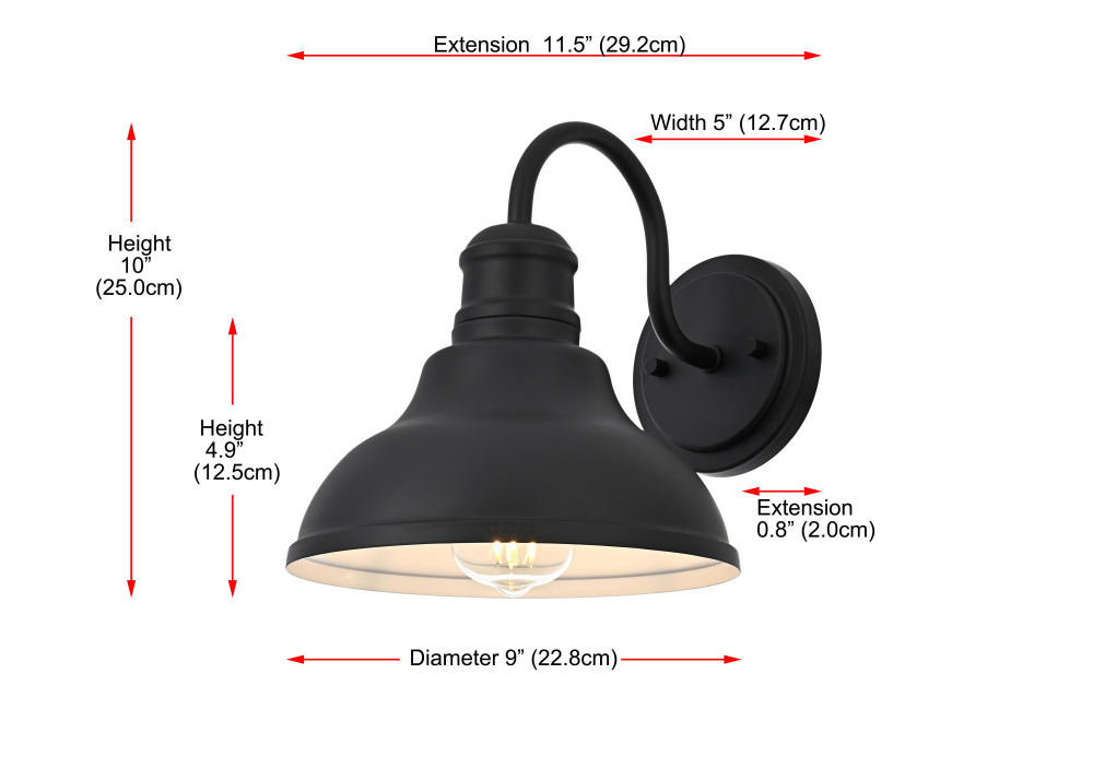 Upgrade outdoor spaces with a barn-style wall light that brings industrial charm with a refined touch. A gently curved metal shade, finished in deep matte black, features tiered detailing near the neck, adding subtle dimension to its bold shape. The wide-open bottom directs light downward, while the crisp white interior maximizes brightness for clear and effective illumination. A gracefully arched gooseneck arm extends from the sturdy circular backplate, keeping the design well-balanced and visually striking. Designed with an E26 socket (bulb not included), this wet-rated wall light is built to withstand the elements, making it an ideal choice for patios, garage doors, and entryways. Whether styled with a warm Edison bulb for vintage appeal or a bright LED for modern efficiency, this statement-making outdoor sconce delivers both function and style.