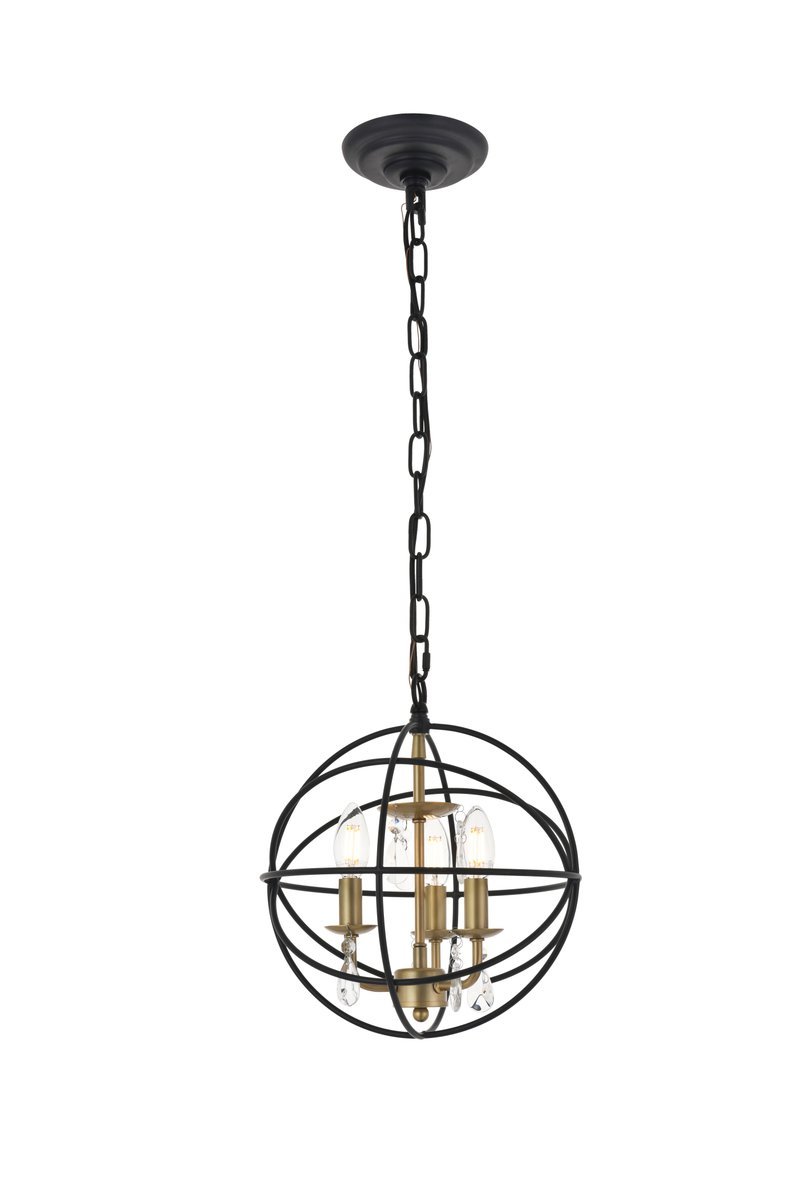 Two-toned brass and black finish open gyroscopic frame with suspended crystals hanging from the bobeche, offering a stylish old world charm