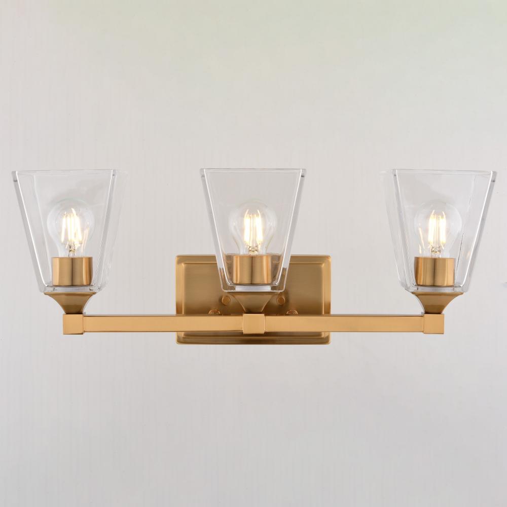Elevate your bathroom with the elegant Wallingford vanity light. The thick modern gold finished arms complement the clear rectangular tapered glass to create a sturdy, yet timeless traditional look. Ideal for adding over either dual or single sinks in your primary, secondary bathrooms or powder rooms.