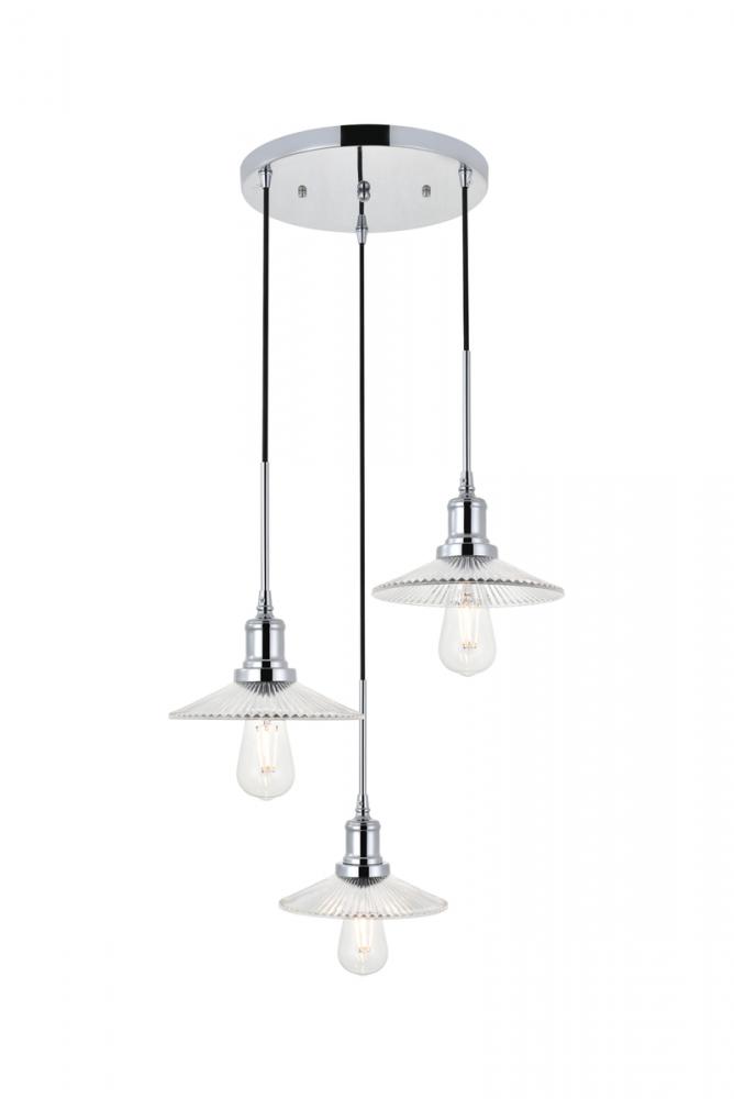 Chrome finish 3-light pendant light and short cone shaped shade hanging from a circular canopy