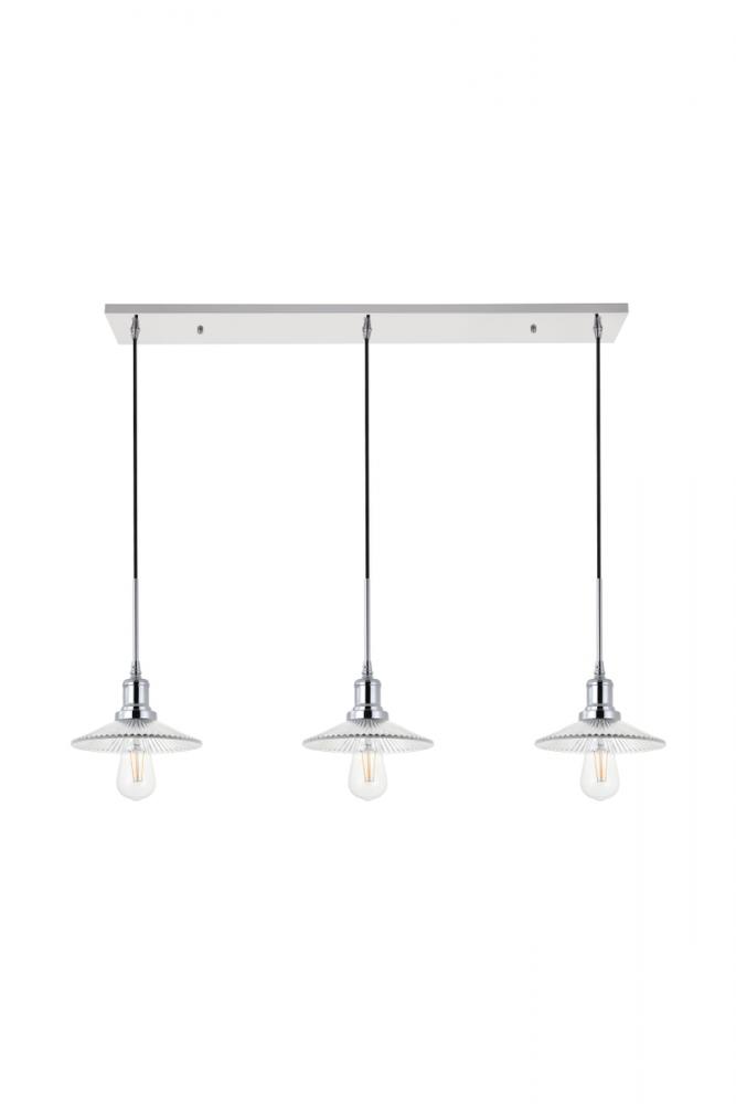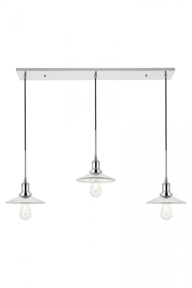 Chrome finish 3-light pendant light and short cone shaped shade hanging from a rectangular canopy