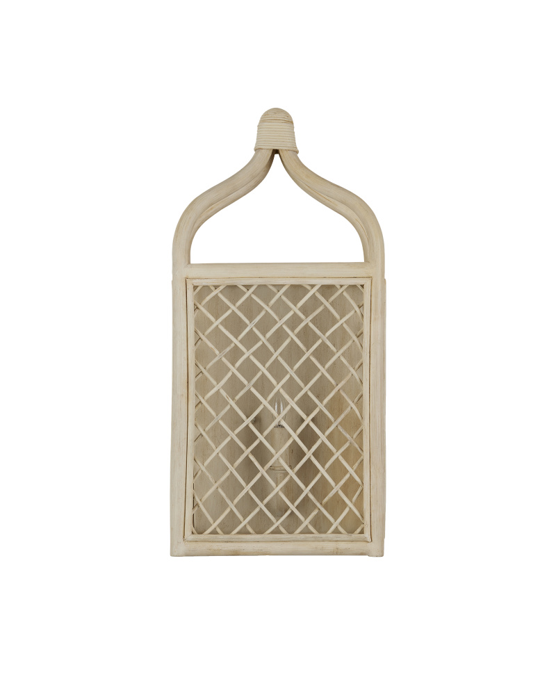 Achieving a traditional lantern shape entirely from rattan is a feat, one that was beautifully realized when artisans wove the Wanstead Ivory Wall Sconce from the natural material, slicing the normal depth in half while retaining the charm of the style. Both the thin and thick ribs intermingling to create the rattan lantern have been bleached to lighten the design. The antique Pearl finish on the hardware enhances the airiness of the beige sconce's profile.