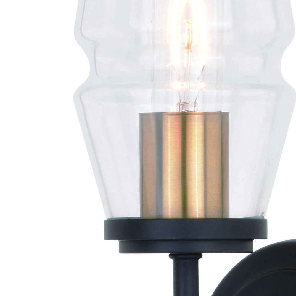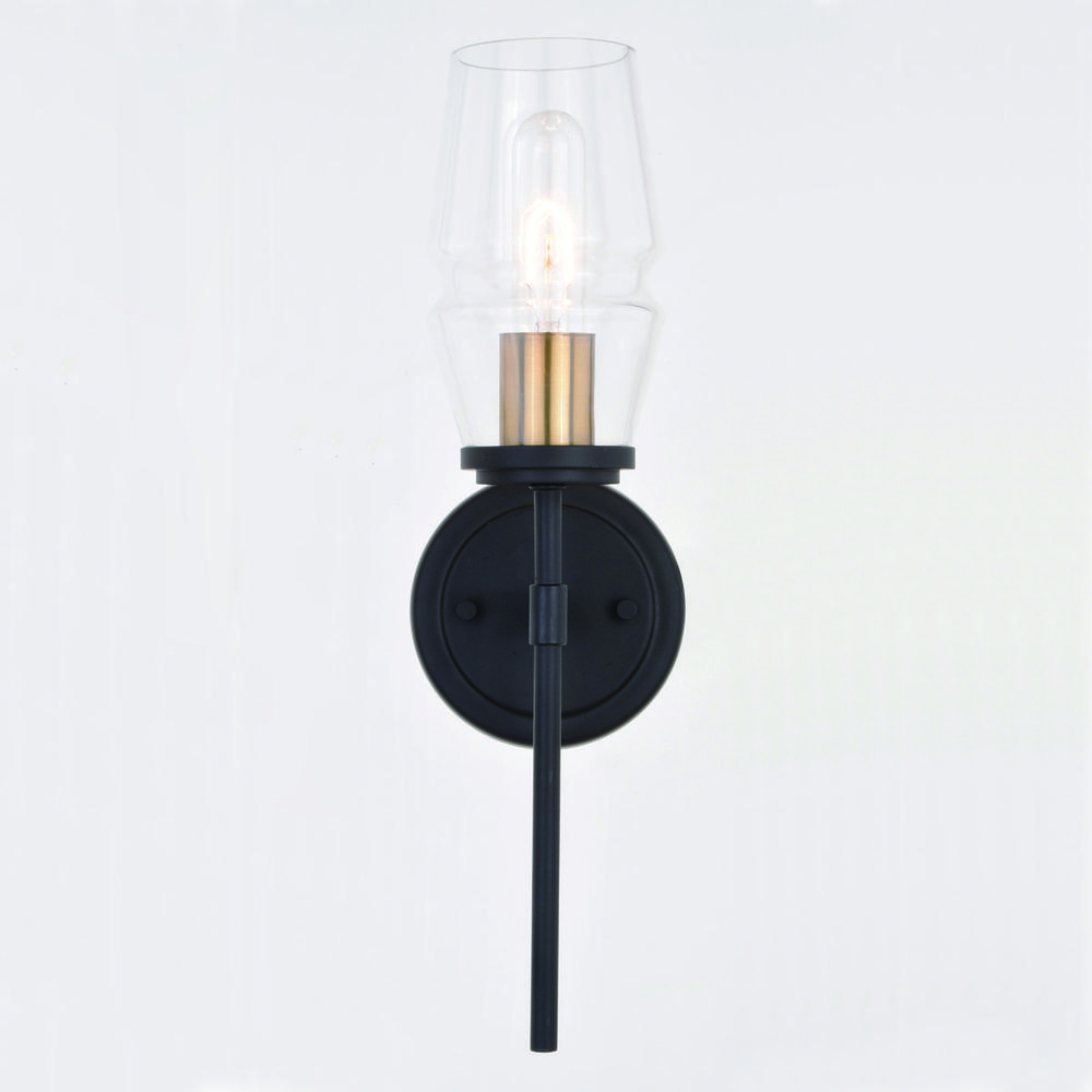 A throwback to mid century modern decor is perfectly represented in the Warren collection. The slightly tapered clear glass shade is supported by a sleek matte black metal bar. Memories of years gone by are brought back to life with the brushed brass accents. Add this vanity wall sconce light to any bath, hallway, or bedroom for an on-trend update.