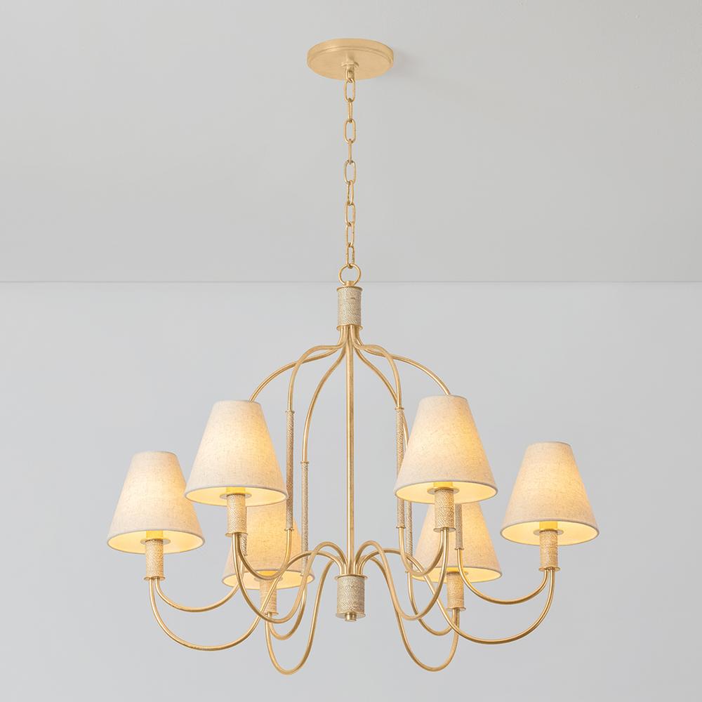The Parisian-inspired designs of the Warrensburg family channel vintage motifs for a fresh take on romantic lighting. The intricate swooping metalwork recalls the shape of an antique carriage, enhanced by the glamorous Vintage Gold Leaf finish. Subtle Abaca-wrapped details and linen shades add natural, artisanal elements. Whether as a 1-light sconce or 6 or 10-light chandelier, Warrensburg brings a dose of fantasy to modern and traditional spaces. Due to the one-of-a-kind nature of the medium, exact colors and patterns may vary slightly from the image shown.