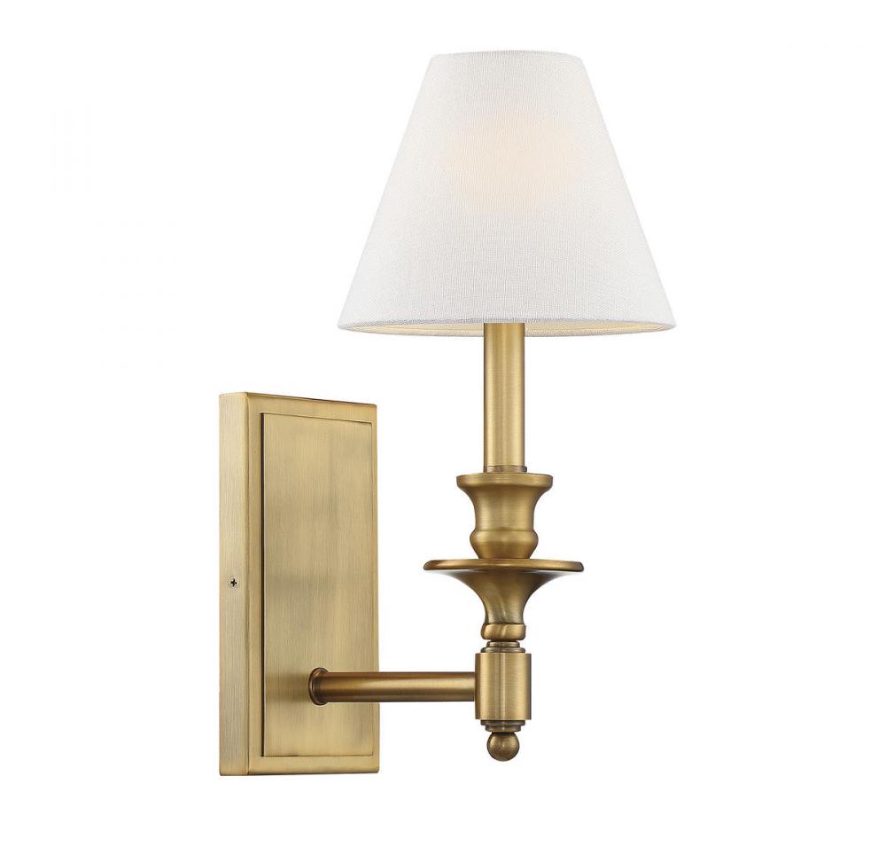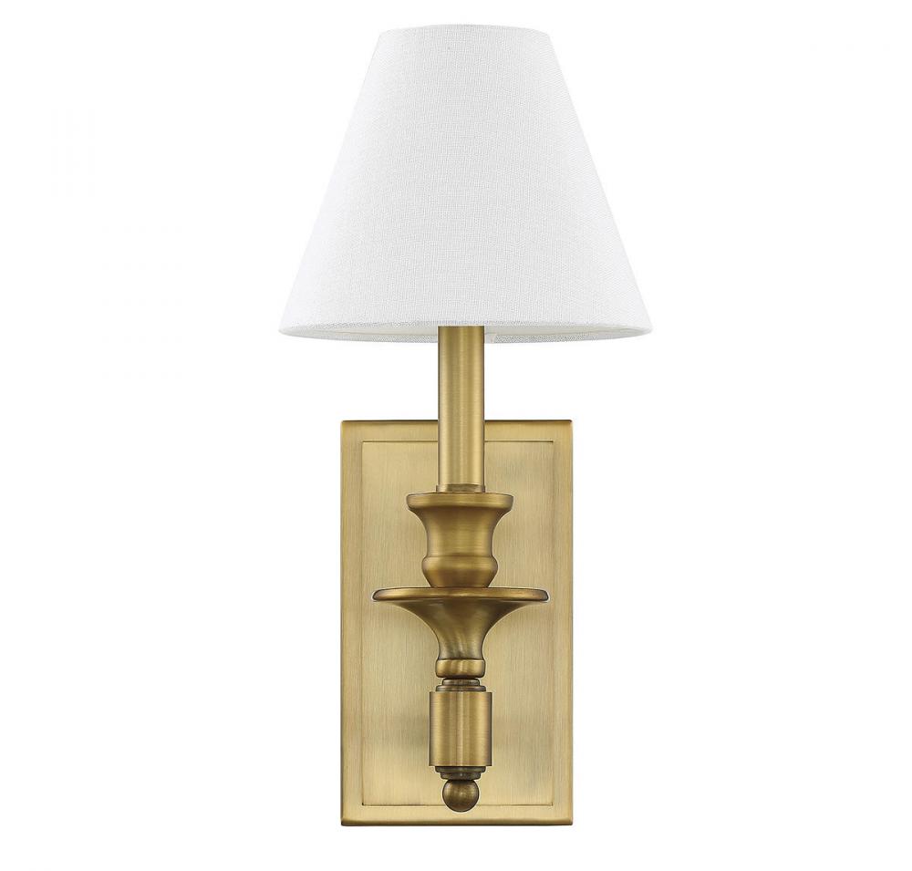 Add an elegant touch to your walls with this Savoy House Washburn 1-light sconce. It has a traditionally-inspired look with clean lines and thoughtful touches. Features a white linen shade and warm brass finish. Sconces add a touch of style and light to any wall, including but certainly not limited to hallways, entryways, stairways, great rooms and dining rooms. You will also often see a pair of sconces flanking a bathroom vanity mirror to provide an even, flattering wash of light. Bulb not included. The warm brass finish can be paired with brass hardware or mixed with hardware in other fixtures. Washburn is perfect for traditional style rooms, but also terrific for transitional style and other styles too! When you choose a Savoy House lighting fixture, you can be certain you’ve selected a piece that will withstand the test of time.