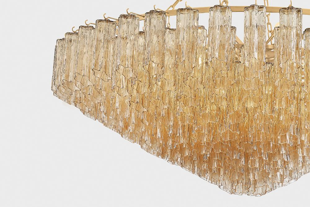 The incredible quantity of layers, lights, and complex glass shapes make Watertown a dramatic showstopper. Inspired by Art Deco aesthetics, this maximalist chandelier features organically shaped Tronchi glass shades with textured cuts. The shades are arranged to form a descending point at the center, reminiscent of water droplets. Watertown is available with 9, 21, or 45 lights.