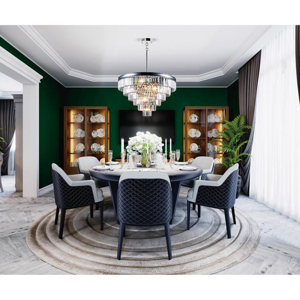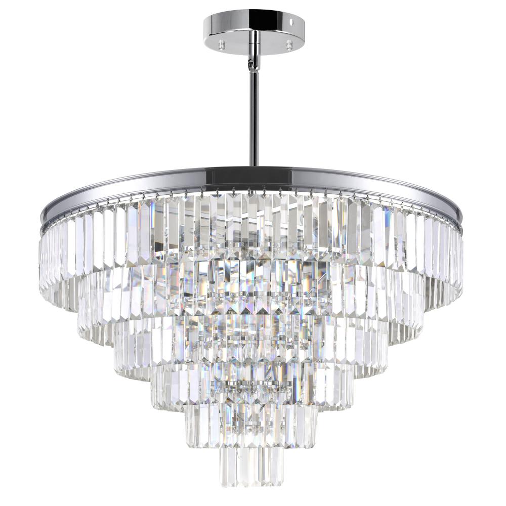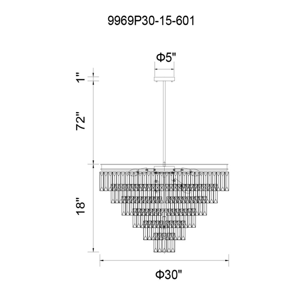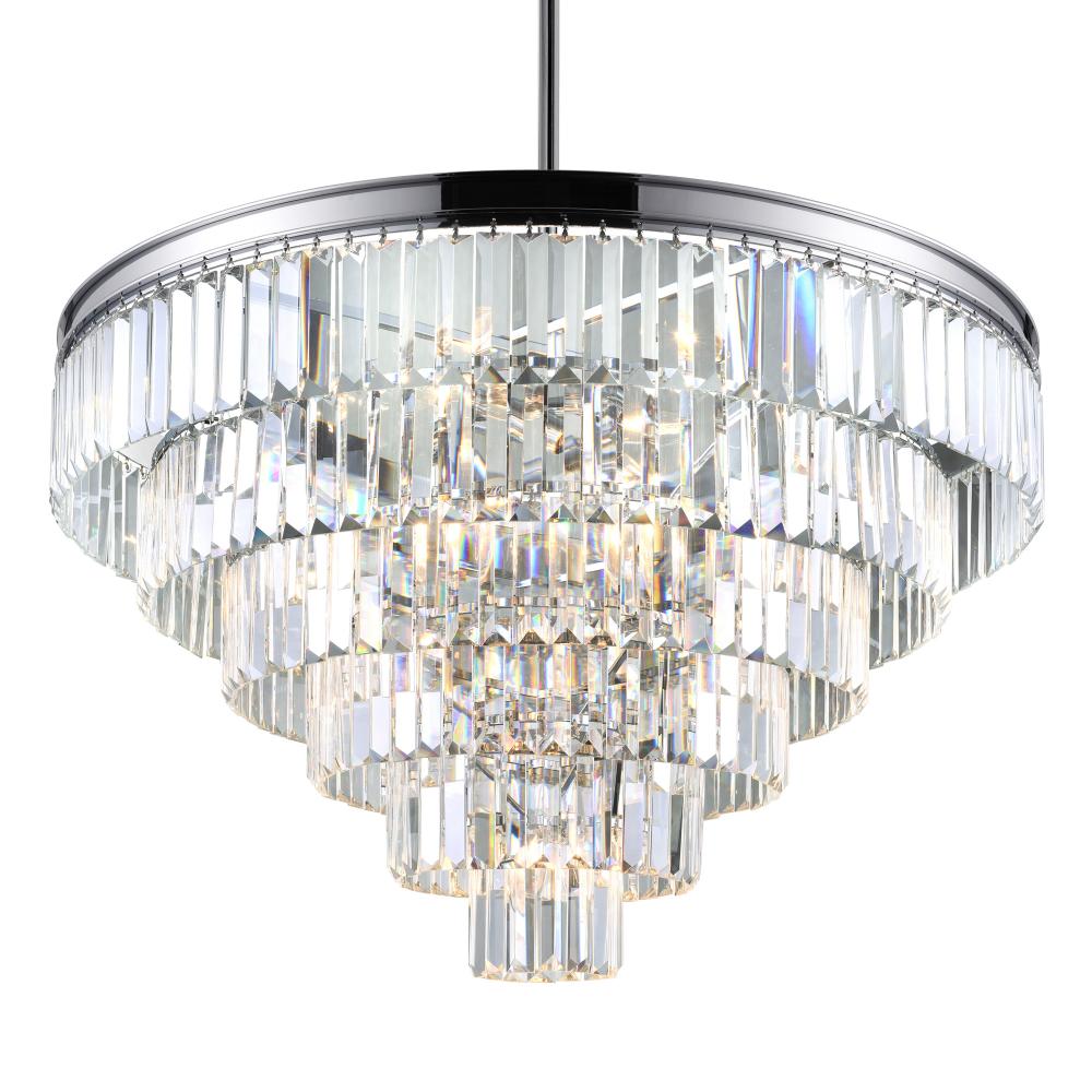 This stunning chandelier showcases exquisite crystal tiers arranged in a timeless traditional design with a touch of modern elegance. Measuring 30 inches in diameter, its grand presence adds instant glamour to any space. The reflective chrome finish and sparkling crystals enhance light, creating a brighter, more open atmosphere. Perfect for adding sophistication and charm to your interiors.