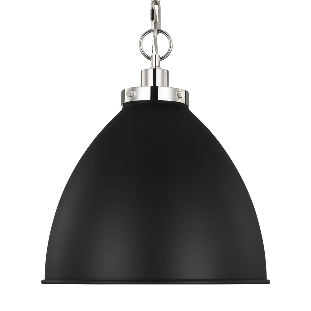 Inspired by various classic utility silhouettes - from factory lighting to barn sconces - capped by contrasting metal hardware. Each shade of the Wellfleet series by Chapman & Myers is available multiple sizes of 3 versatile profiles; either a flat farm dome, a traditional factory dome, or tapered cone. The shades are available with either a black or white finish and are paired with either a burnished brass or polished nickel collar, chain and canopy.