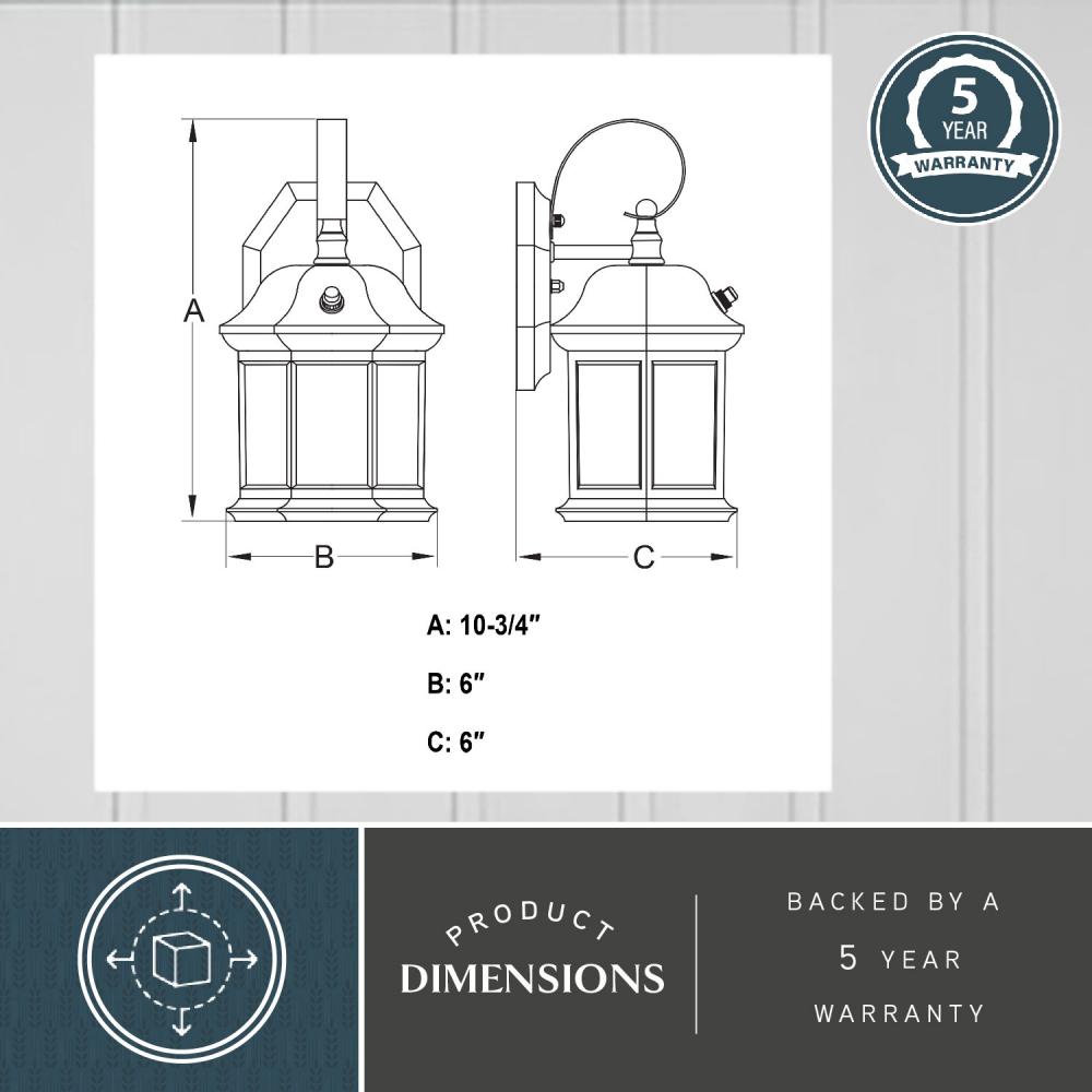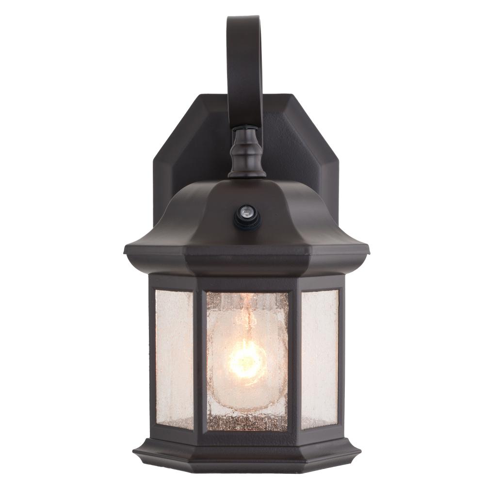 This traditional outdoor wall lantern from the Wellington collection will add a touch of sophistication to the exterior of your home. with its bronze finish and clear seeded glass, this timeless piece provides a great mix of style and functionality. It has a built-in dusk to dawn photocell that automatically turns the light on at dusk and off at dawn, saving energy during daylight hours. This outdoor wall light is ideal for your porch, entryway, garage, or other outdoor area around your home.