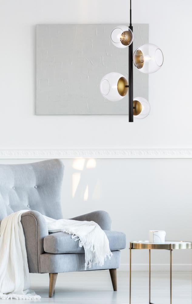 This 4-light modern linear chandelier adds a major mid-century modern style without taking up any valuable floor space. It's made from metal and features a cylindrical shaped body that supports four glass globe shades that diffuses the light from a 40W bulb (not included). This light arrives with an adjustable fabric cord and is dimmable.