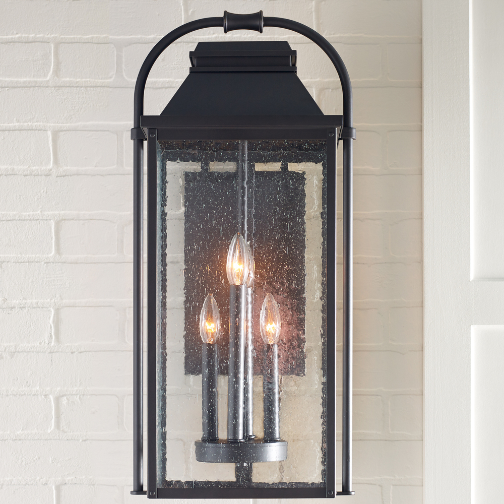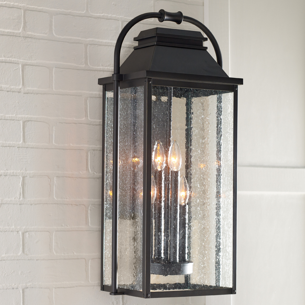 The Sean Lavin Wellsworth four light outdoor wall fixture in antique bronze enhances the beauty of your property, makes your home safer and more secure, and increases the number of pleasurable hours you spend outdoors. A subtle interplay of traditional design elements and nautical influences creates the charming visual approach to the Wellsworth outdoor collection by Visual Comfort Studio. Available in three finishes and two different aesthetics. Antique Bronze finish paired with Clear Seeded glass creates a more traditional look to these outdoor light fixtures; while Burnished Brass and Painted Brushed Steel finish coupled with Clear glass reflects a more contemporary approach. The Wellsworth collection includes a 3-light outdoor pendant, a 3-light outdoor post lantern, and 3-light small and medium outdoor lanterns, as well as a 4-light large outdoor lantern. Cast aluminum construction ensures durability. Wet Rated.