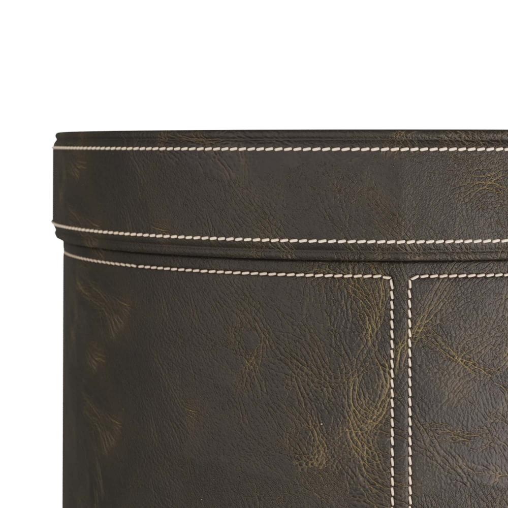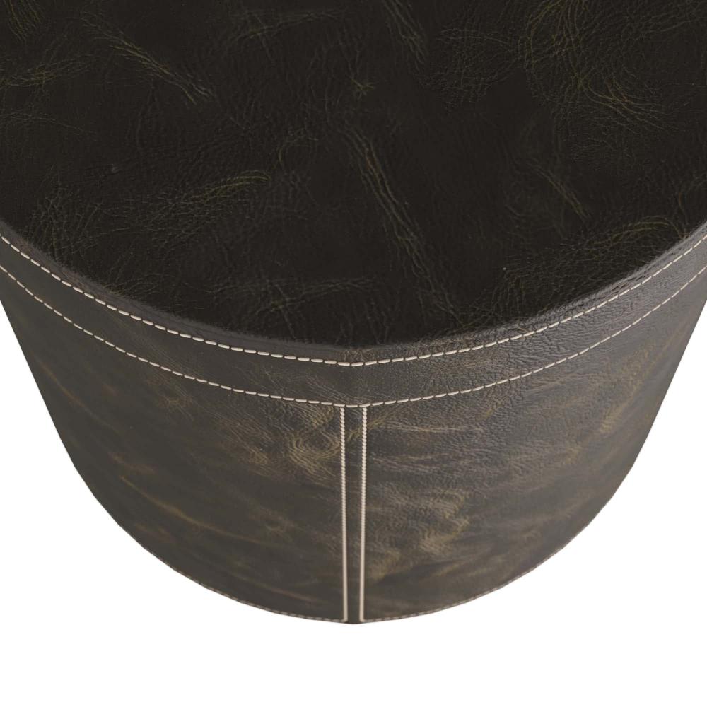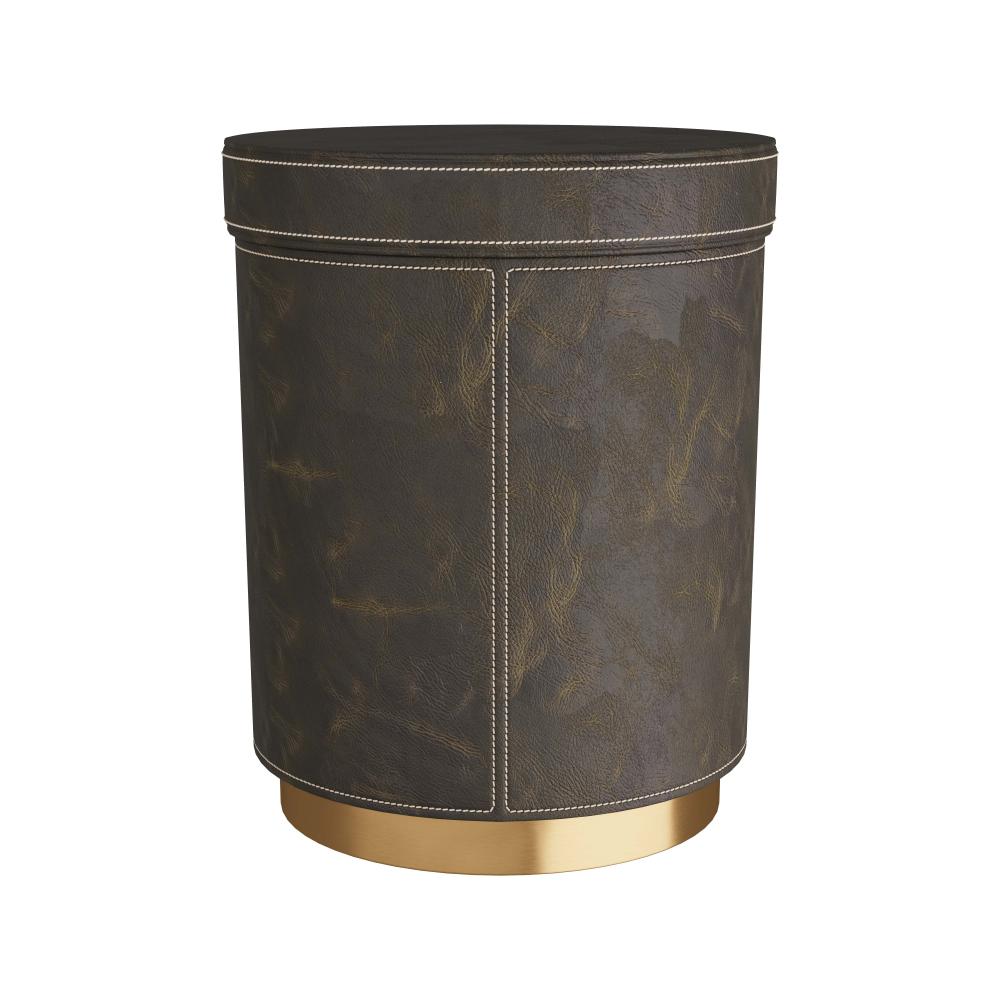 OUR WES DRUM TABLE DOES DOUBLE DUTY, SERVING AS A CACHE FOR STORING THROWS AND THE LIKE. THE HANDSOME ACCENT PIECE IS CREATED IN MOSS LEATHER, WITH CONTRASTING STITCHING, AND FASHIONED WITH A LID THAT LIFTS TO REVEAL THE BLACK SUEDE-LINED STORAGE INSIDE. THE DRUM RESTS ON AN ANTIQUE BRASS PLINTH. FINISH WILL VARY.