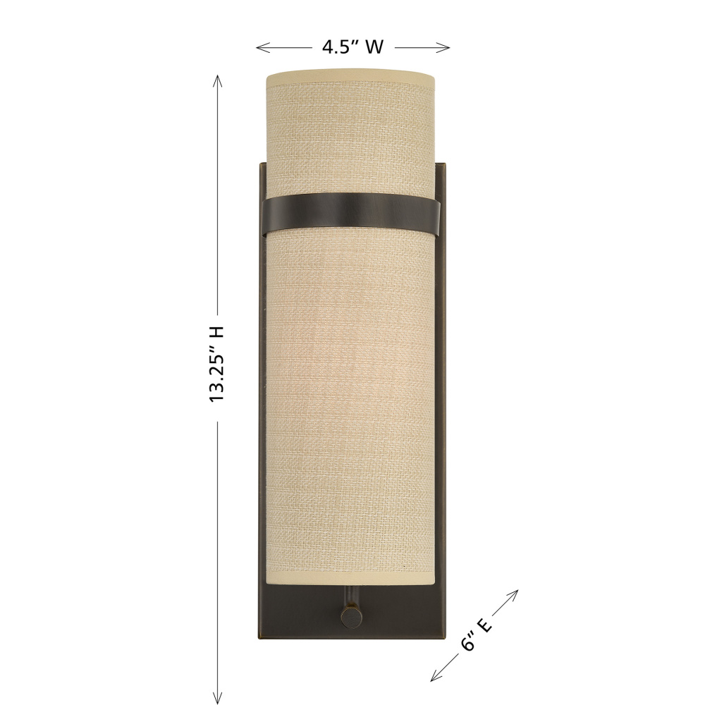 The Savoy House Weston 1-light sconce brings a poised, New Traditional spirit to any space. Its tall, slender beige fabric shade, complete with a softly textured vertical pattern, adds warmth and refinement while the Mediterranean Bronze finish grounds the look with classic richness. Weston is 13.25" tall, 4.5" wide and extends 6" from the wall. It uses one candelabra size bulb of up to 60 watts. Bulb not included. Install as a hardwired fixture or plug it into a wall outlet for convenient placement. Designed by Dann Foley, an award-winning interior designer with a reputation for style, taste and quality.
