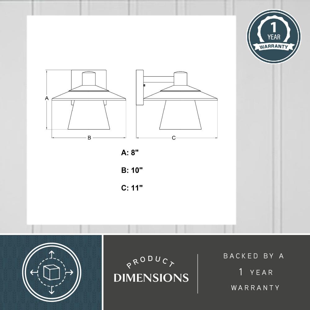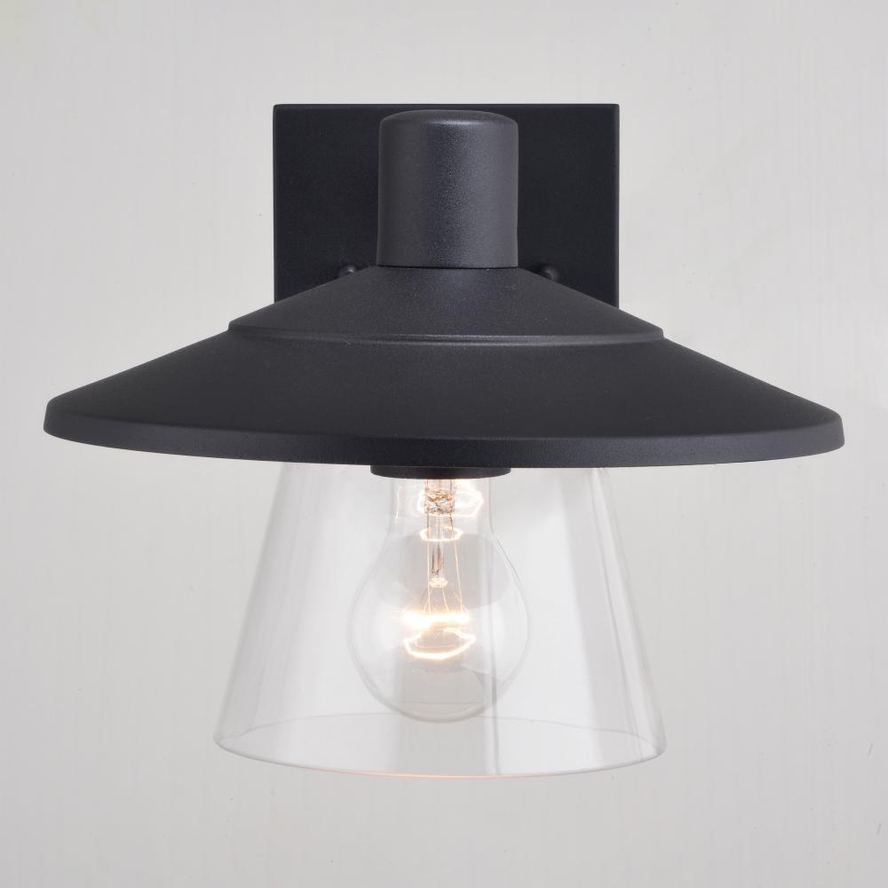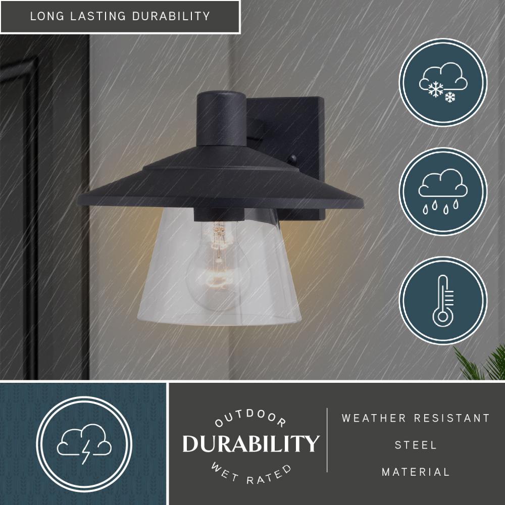 The Westport collection is a great choice for adding a modern coastal touch to your outdoor space at a great value. The textured black finish, angled metal top, and clear glass shade give this wall light a warm and inviting elegance. This outdoor wall light is ideal for your covered porch, entryway, garage, cabana or any other outdoor area around your home. The built-in dusk to dawn photocell automatically turns the light on at dusk and off at dawn, saving energy during daylight hours.