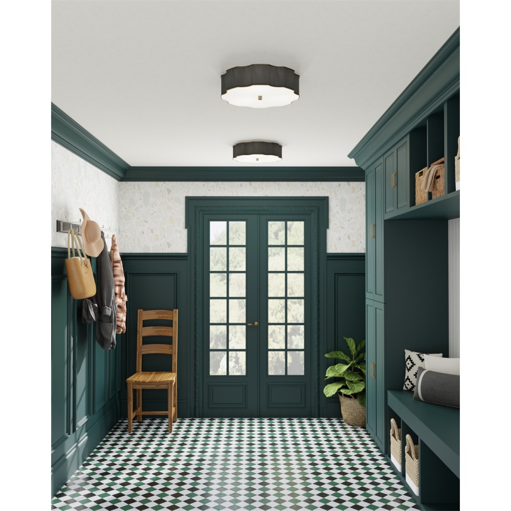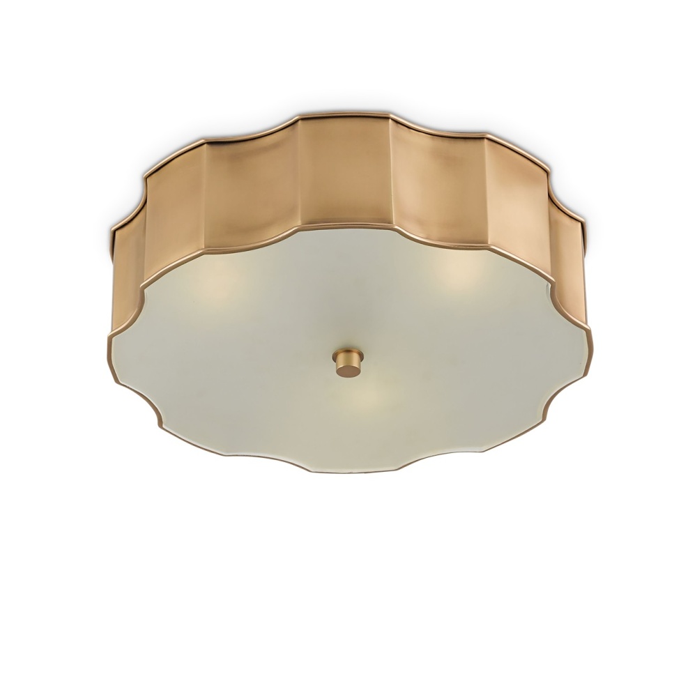 Tastefully restrained and endlessly adaptable, it's easy to see why the Wexford Flush Mount has been one of our bestsellers. The exterior ridges of this appealing three-light fixture, which are made of brass, have been treated to an antique brass finish. The warmth of the surface is a lovely complement to the soft glow produced by an opaque glass diffuser fitted with a finial in a matching antique brass.