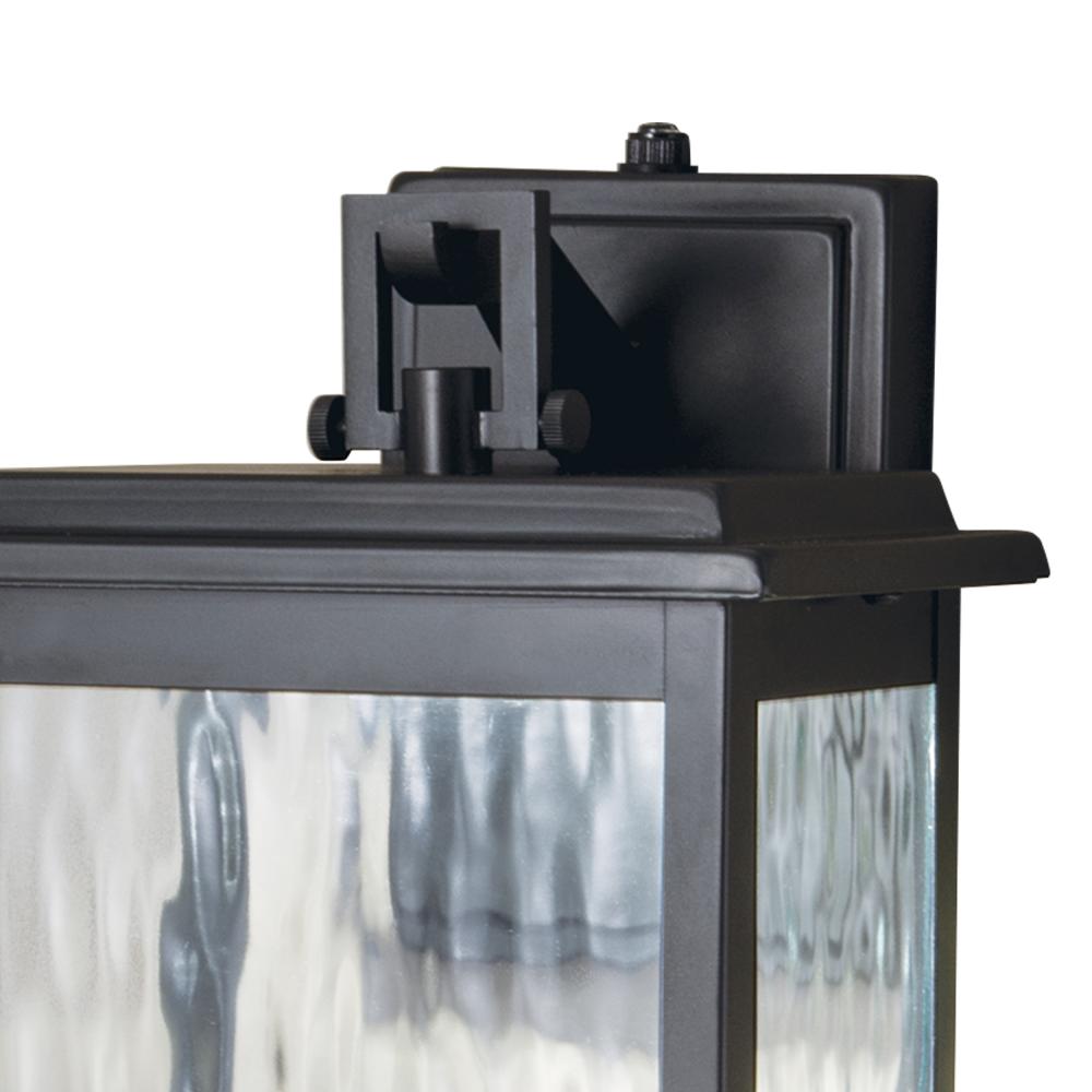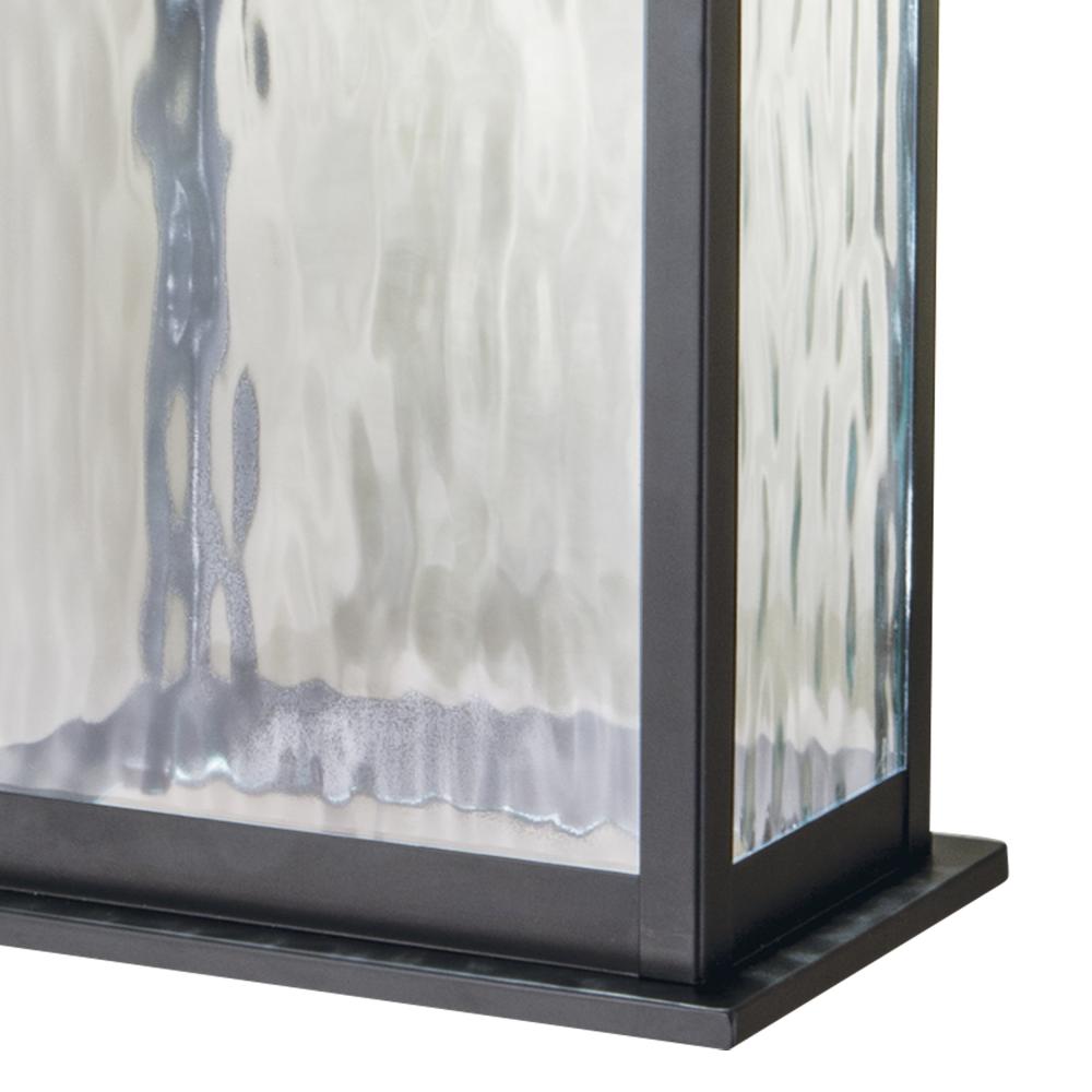 The Weymouth Outdoor sconce has a built in photo sensor that comes on at dusk and turns off at dawn. With angular lines and substantial wavy glass surfaces spreads ample LED illumination to