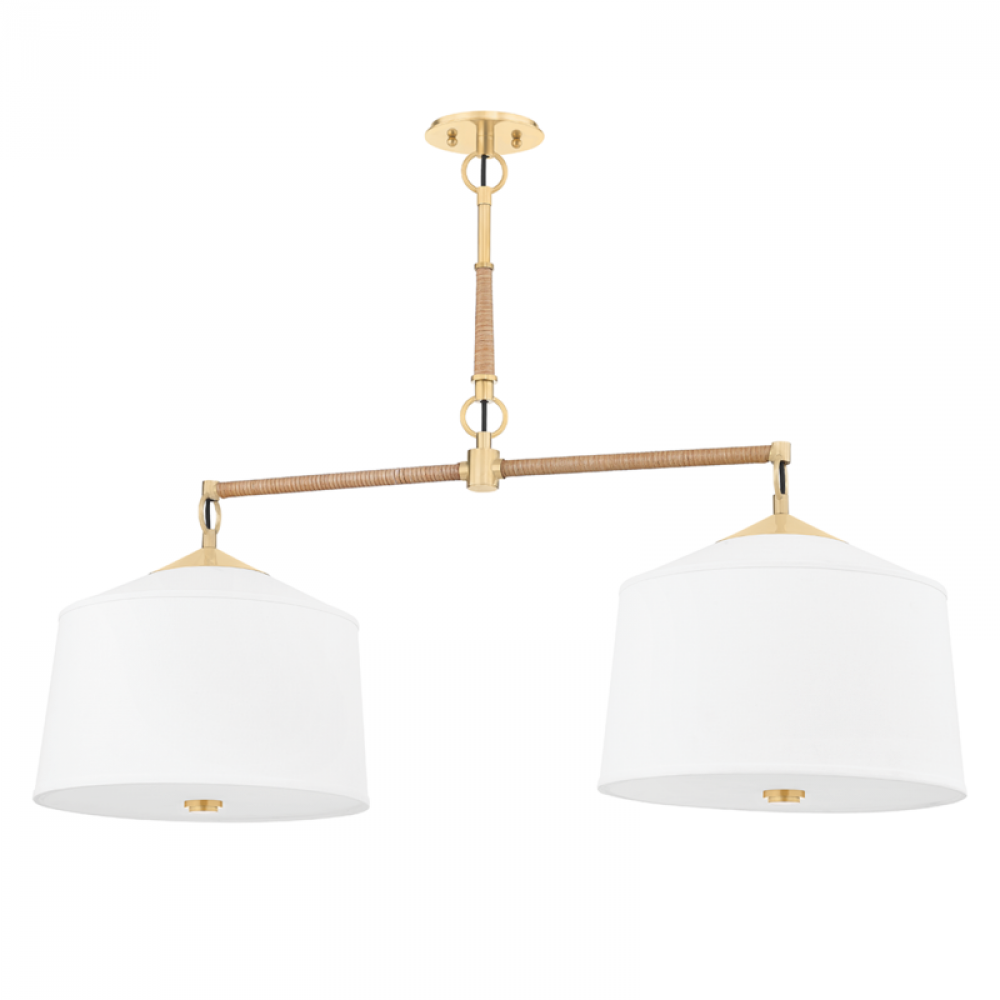 A classic shape with luxury details, White Plains is the perfect piece for transitional interiors. The clean, crisp white linen shade blends beautifully with the sleek solid brass metalwork and natural wrapped rattan for a look that is warm yet modern. Choose from a sconce, semi-flush, pendant and linear in an Aged Brass finish.