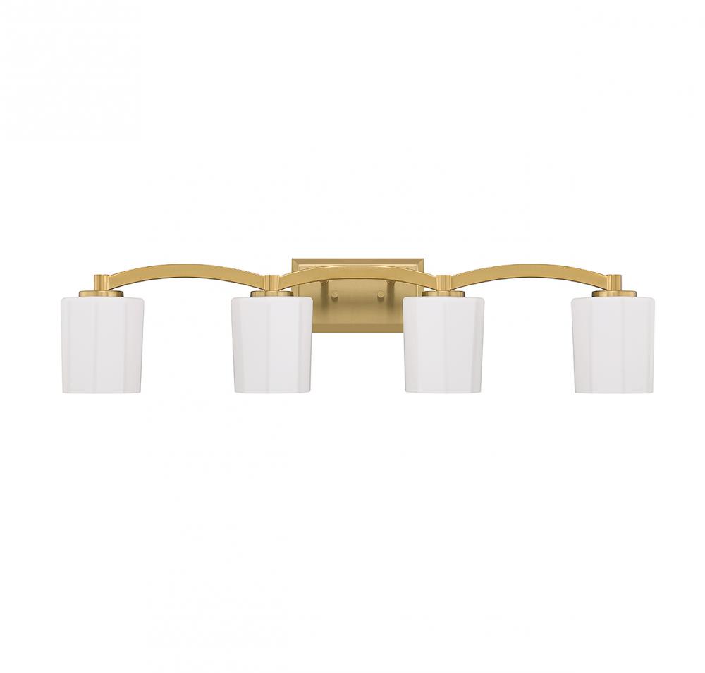 Get understated glamour for the bathroom with this Savoy House Whitney 4-light bath vanity light. Fluted shades of opal etched glass offer up a flattering glow, the curving arm adds intrigue and the warm brass finish adds versatility. Whitney is 8" in height, 33" in width and extends 6.5" from the wall. It uses four standard size bulbs of up to 60 watts per bulb (bulbs not included).