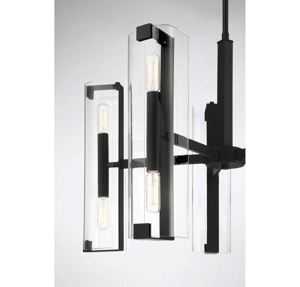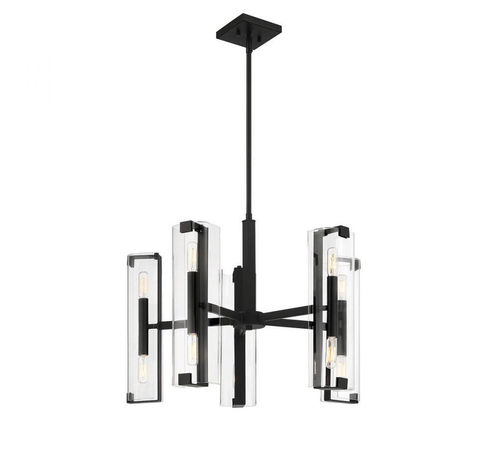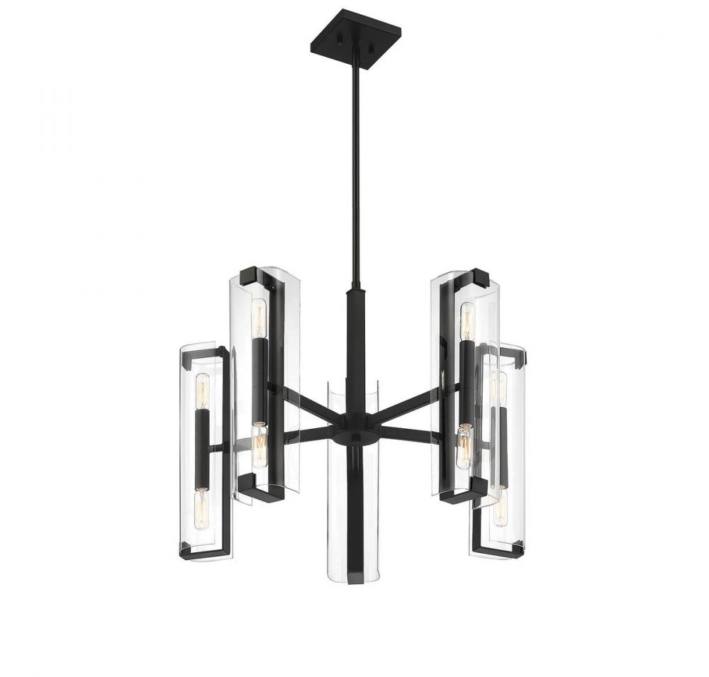 Sleek and sophisticated! The Savoy House Winfield 10-light chandelier has an eye-catching design, yet the clean lines and transparent glass keep the mood serene. Bold straight lines of the downrod, frame and bulb sockets are highlighted by the matte black finish. Each of the five light arms holds two 60W candelabra size bulbs, one facing up and one facing down, for splendid illumination through the pristine clear glass shades. This chandelier measures 25" wide and has an adjustable height ranging from 24.5" to 70.5". Overall, it’s a chic and stylish fixture for your dining room, living room, entryway, kitchen, family room, office, bedroom or media room.