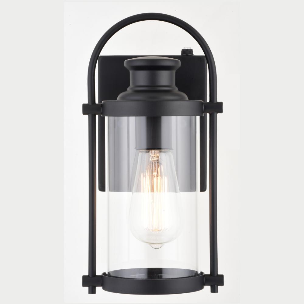 With its distinctive wrap-around handle, the Winfield collection is a blend of both transitional and contemporary styling. The matte black finish and clear cylindrical glass shade will enhance any home exterior. It has a built-in dusk to dawn photocell that automatically turns the light on at dusk and turns it off at dawn, saving energy during daylight hours. This outdoor wall light is ideal for your covered porch, entryway, or garage.