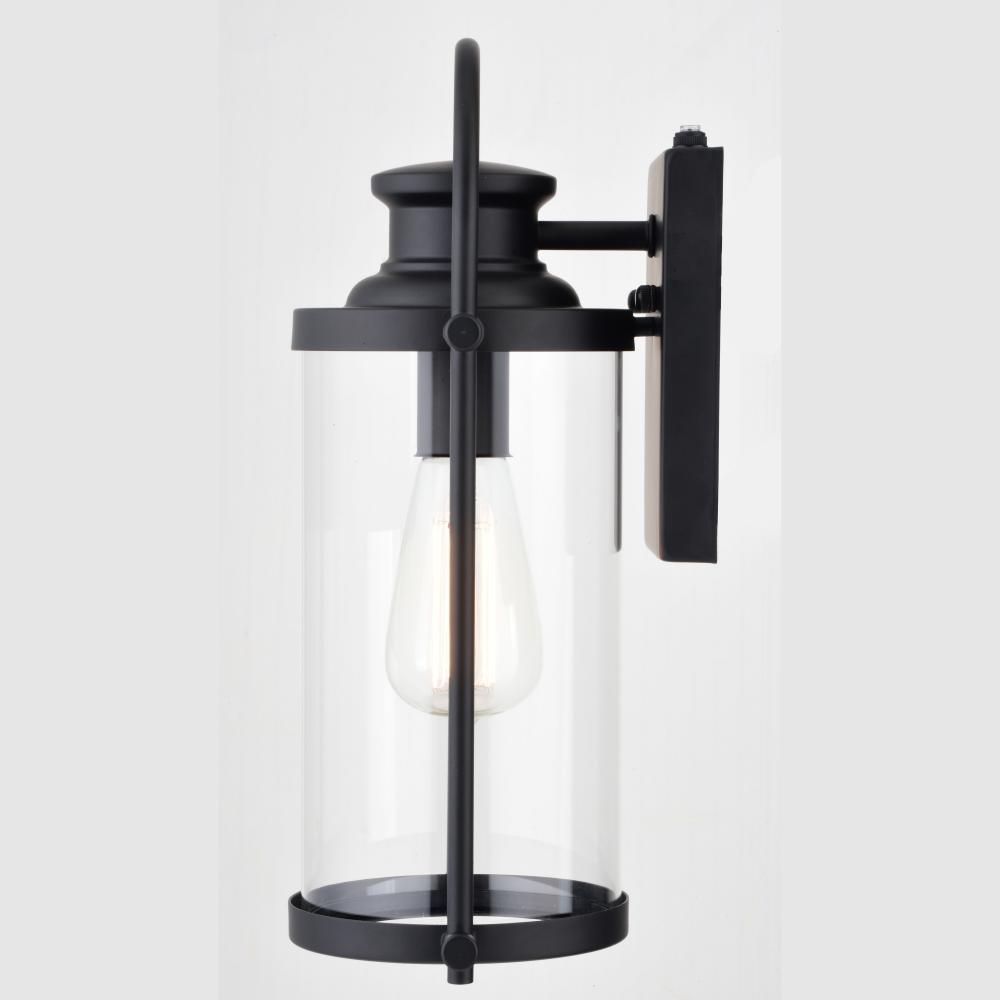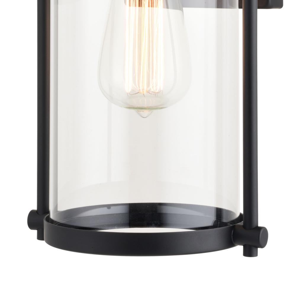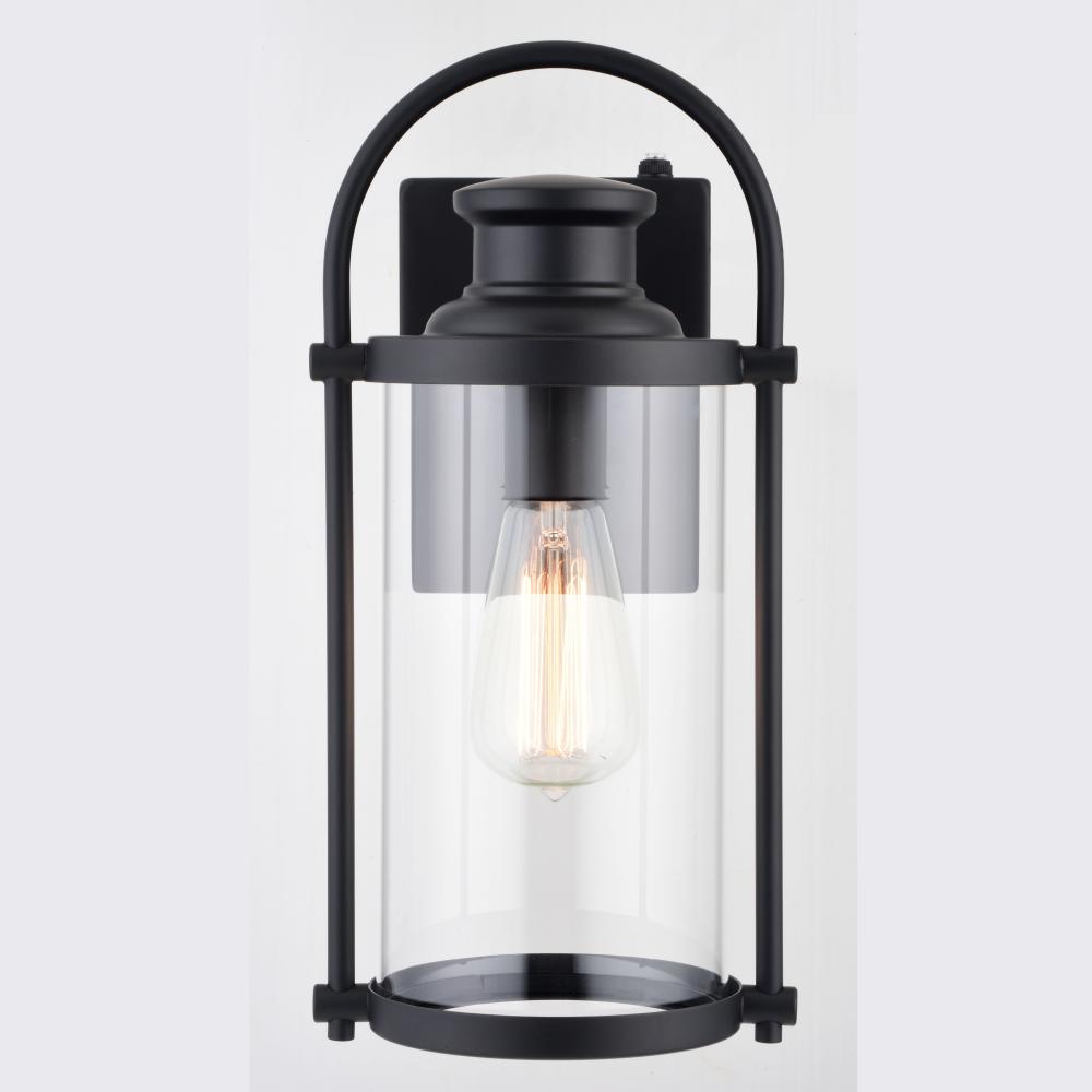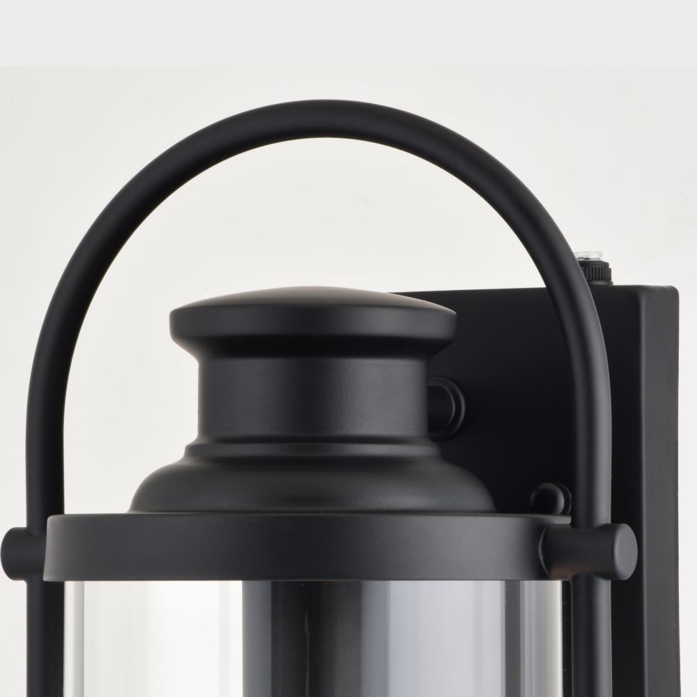 With its distinctive wrap-around handle, the Winfield collection is a blend of both transitional and contemporary styling. The matte black finish and clear cylindrical glass shade will enhance any home exterior. It has a built-in dusk to dawn photocell that automatically turns the light on at dusk and turns it off at dawn, saving energy during daylight hours. This outdoor wall light is ideal for your covered porch, entryway, or garage.