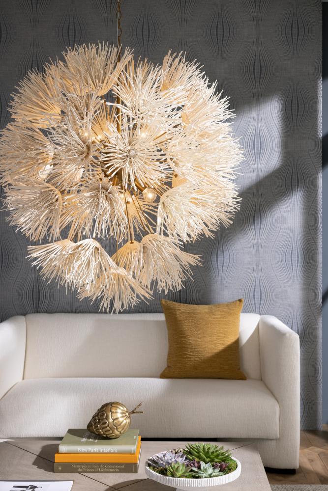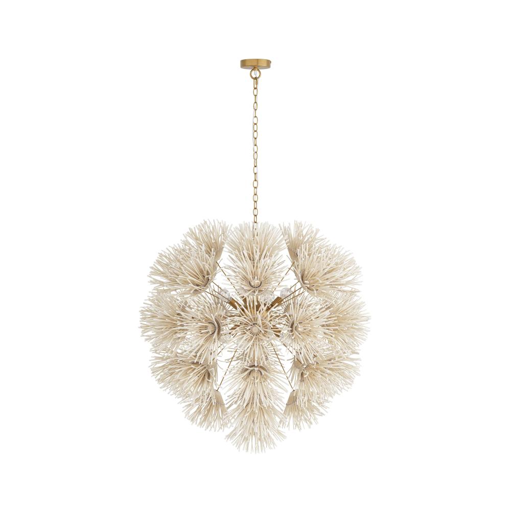 WILD AND WORLDLY, THE WINONA CHANDELIER IS CLEVERLY CRAFTED WITH IVORY COCONUT SHELLS THAT ARE HAND-FORMED INTO DELICATE DANDELION SHAPES. THE ARTISANAL PIECE, IN AN ACORN-SHAPED SILHOUETTE, IS CONSTRUCTED WITH A CHAIN LINK SUSPENSION IN ANTIQUE BRASS STEEL. FINISH WILL VARY.