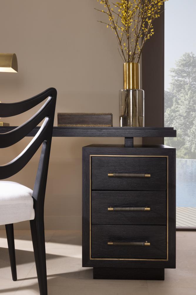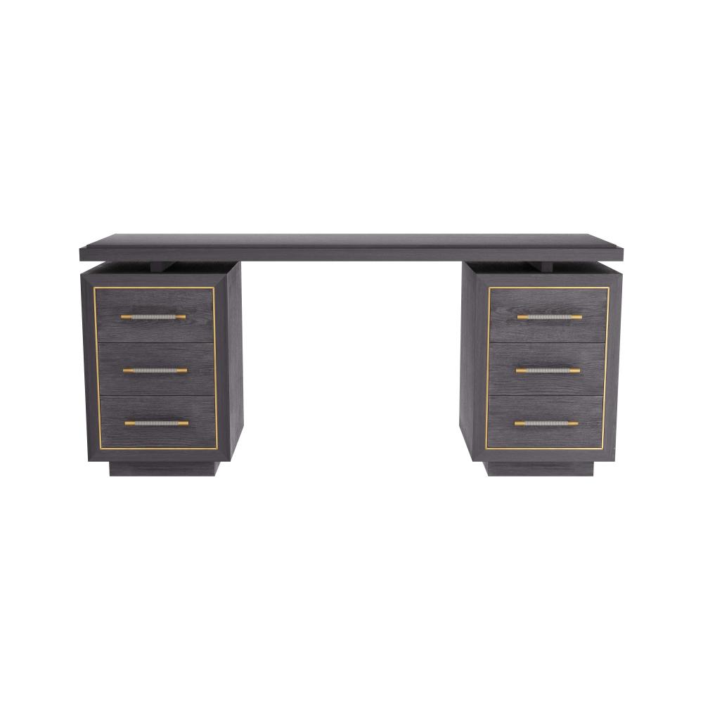 OUR DECO-INSPIRED WIXOM DESK IS LAVISHED WITH RICH DETAIL. CREATED IN EBONY OAK, THE STRIKING EXECUTIVE DESK IS DESIGNED WITH A CANTILEVERED DESKTOP THAT FLOATS ATOP TWO SETS OF DEEP DRAWERS, WHICH ARE FRAMED WITH ANTIQUE BRASS INLAYS. LINEAR ANTIQUE BRASS HARDWARE IS WRAPPED IN GRAPHITE LEATHER FOR ADDED FLOURISH. GRAY SUEDE LINES THE SIX STORAGE DRAWERS. FINISH WILL VARY. ASSEMBLY REQUIRED.
