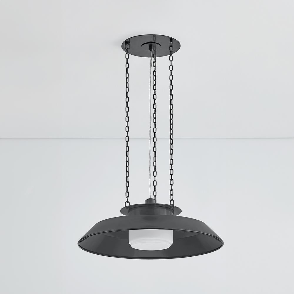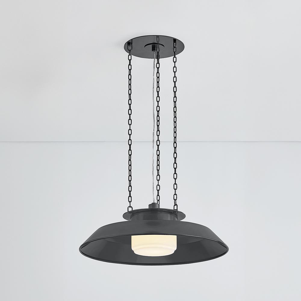 Taking cues from the innovative lamping techniques of bespoke maker brands, Woodrow features a classic RLM-style pendant silhouette. Beneath the large reflector, the opal shiny shade filters light both downwards and outwards. Three clean chains suspend this fixture, which is available in two sizes.