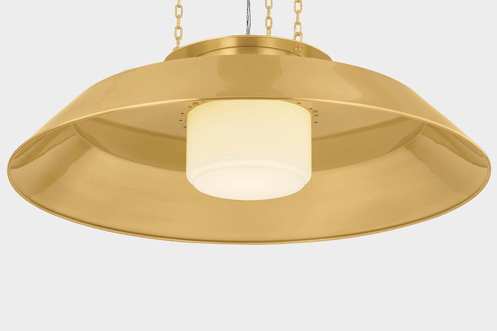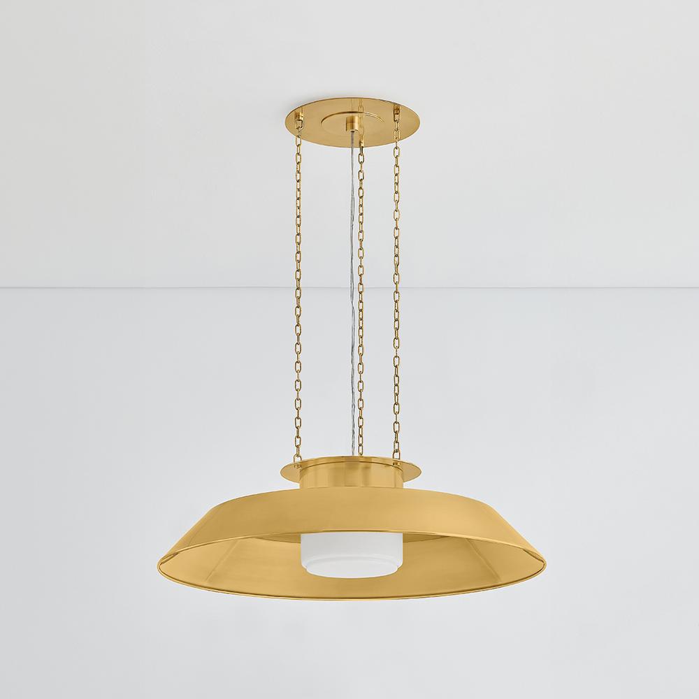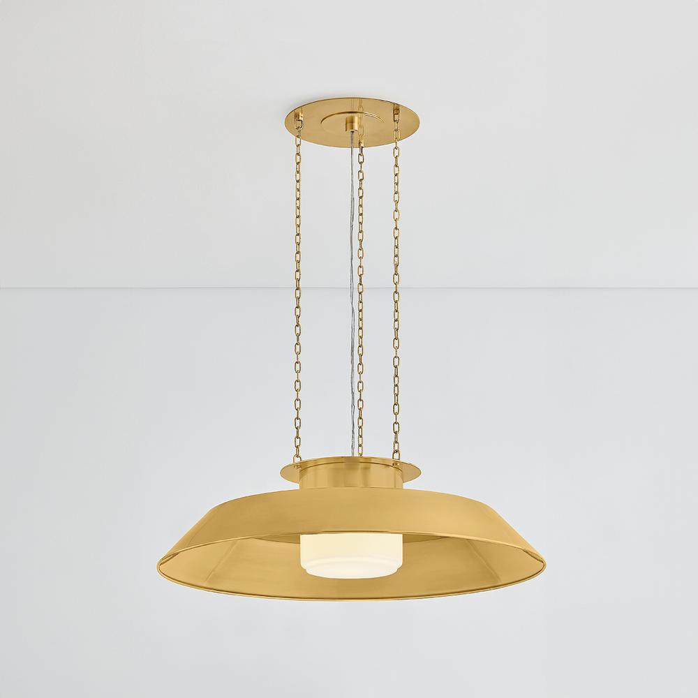 Taking cues from the innovative lamping techniques of bespoke maker brands, Woodrow features a classic RLM-style pendant silhouette. Beneath the large reflector, the opal shiny shade filters light both downwards and outwards. Three clean chains suspend this fixture, which is available in two sizes.