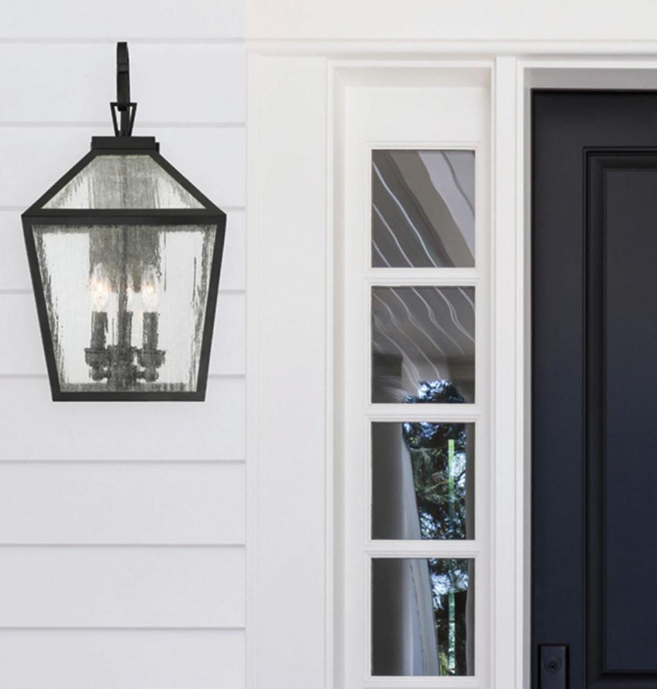 The traditional charm of vintage lanterns blends beautifully with streamlined, contemporary appeal in this Woodstock outdoor fixture. Everyone who enters your home will feel welcomed, and appreciate its classic style. The high-quality matte black finish matches with every sort of architectural element and color palette, and the greenhouse-like frame of the lantern is affixed with a graceful hook & wall plate. Clear seeded glass panes add wonderful textural interest and allow maximum illumination that is both safe and attractive. Three metal candle covers hold 60W bulbs. 12” wide by 23.5” high size makes it easy to place multiples of these lanterns on the walls of your porch, patio, sunroom, garage, or pergola.